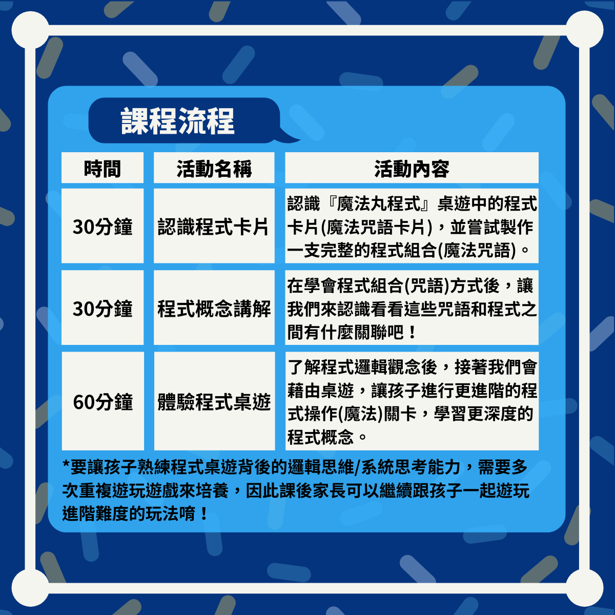 09/18(六) 下午15-17:00 / 2小時 / 費用 689元/人 (贈送售價690元《魔法丸程式》桌遊1套、學習手冊1本)。