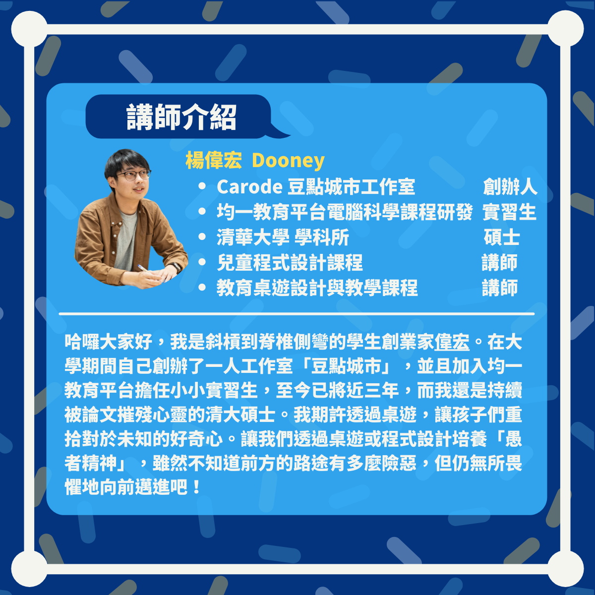 |桌遊教學線上課程1堂|:讓各位體驗並講解桌遊操作方法,幫助各位順利運用於程式教學中,上課時間(自由參加):09/19(日) 下午15-17:00 / 2小時 。