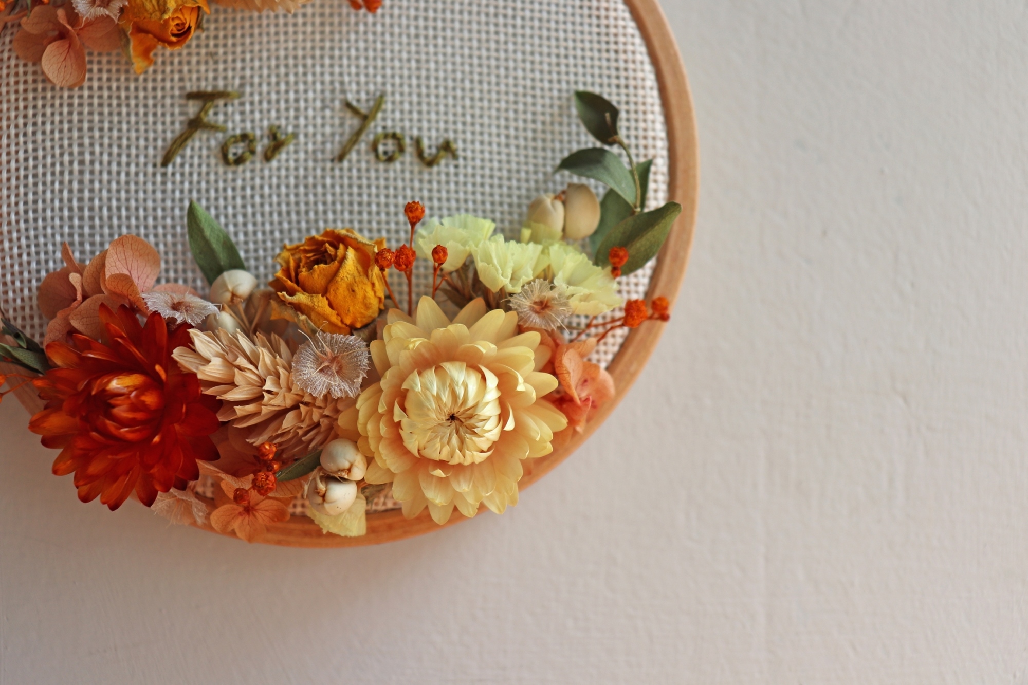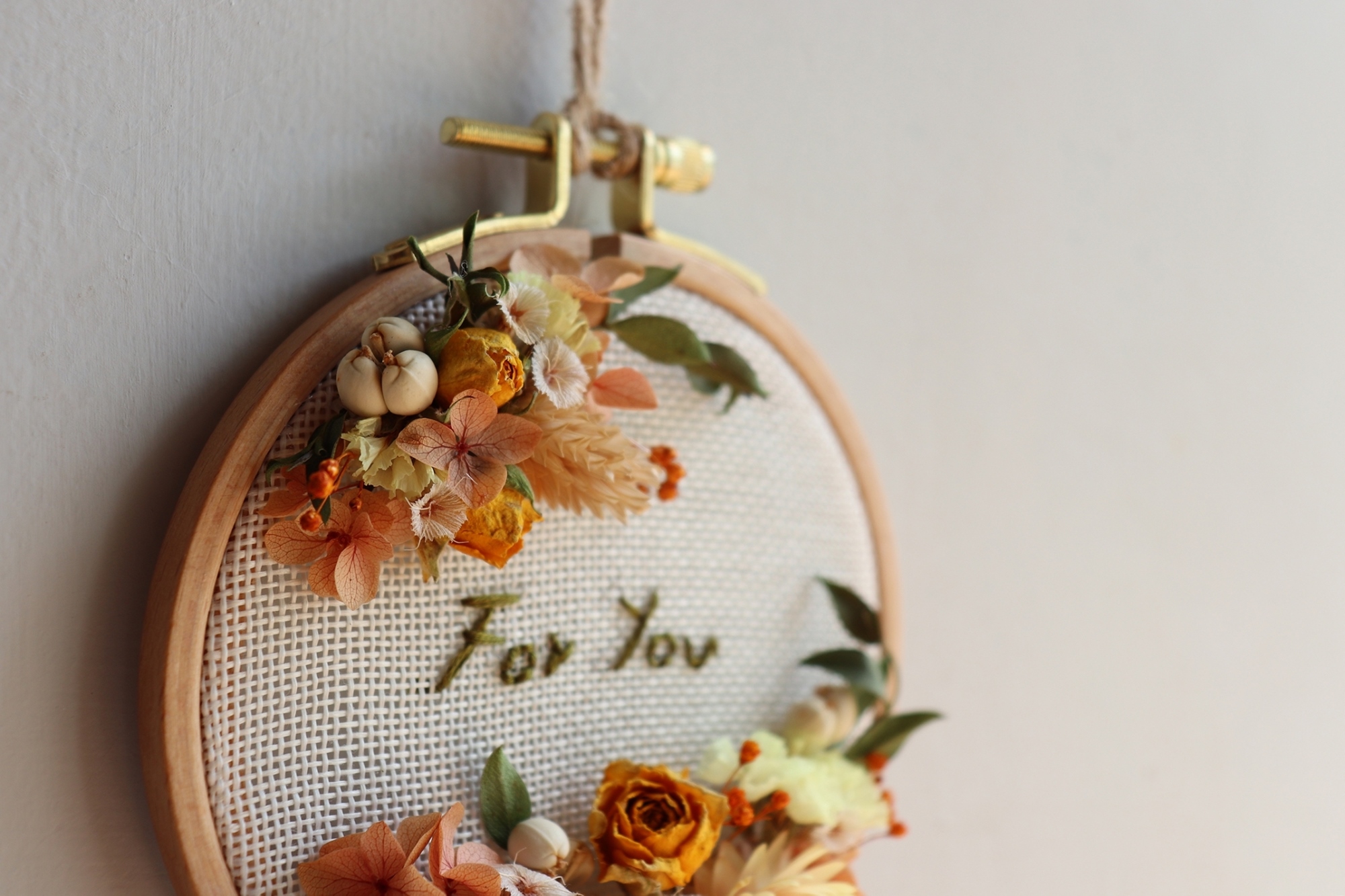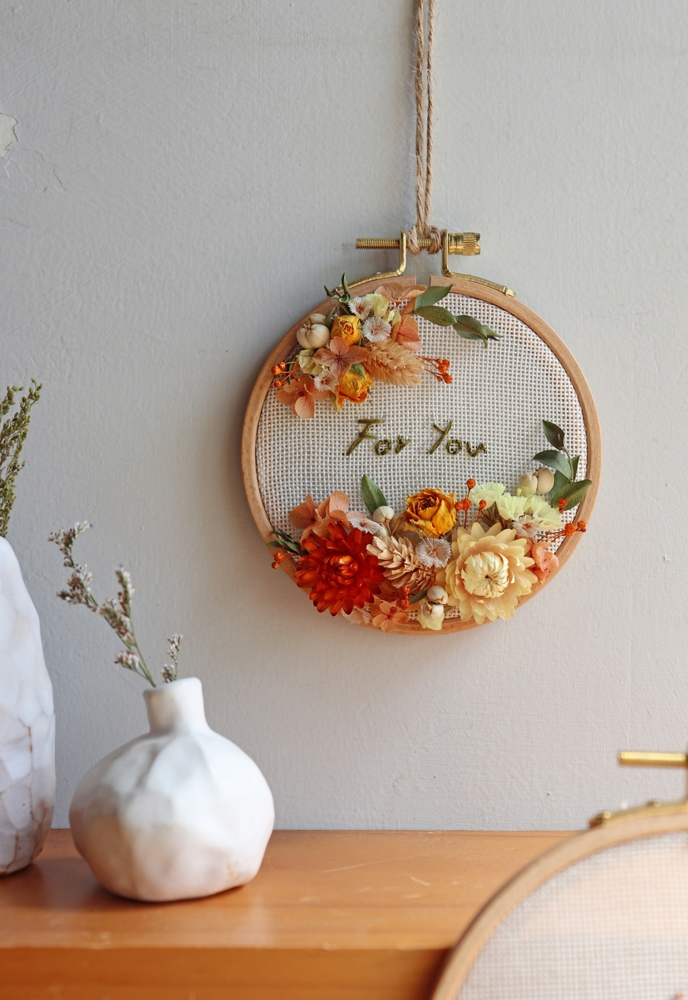 A:材料包內含 → 木質繡繃、繡布、各式乾燥花材、麻繩、課程專屬精美小卡