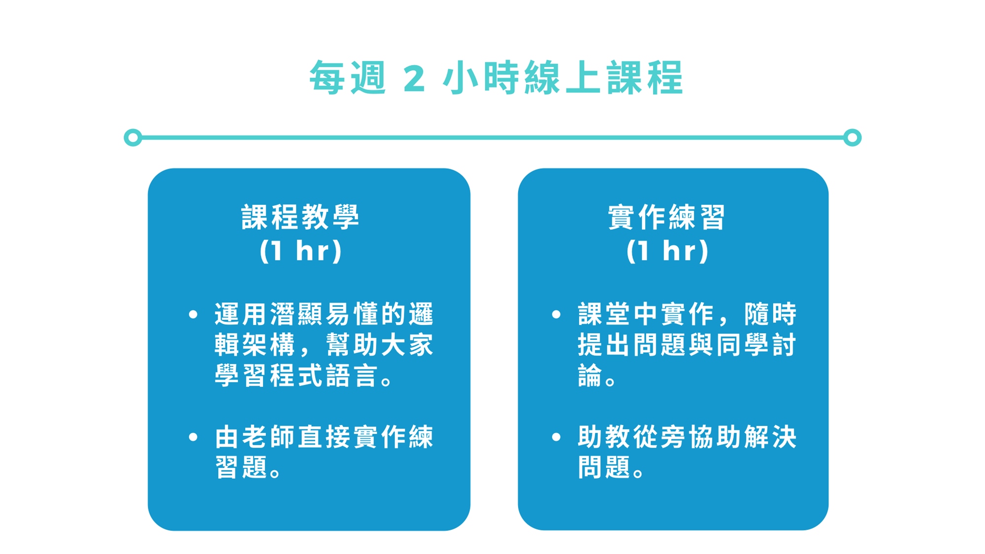 每週 2 小時線上課程,由老師帶同學進行實作,從練習中拆解問題,達到將語法實現的能力。由老師、同學一起進行互動討論,達到真正的教學相長,遇到問題也可以隨時詢問助教,幫助你將學習阻礙減到最小。