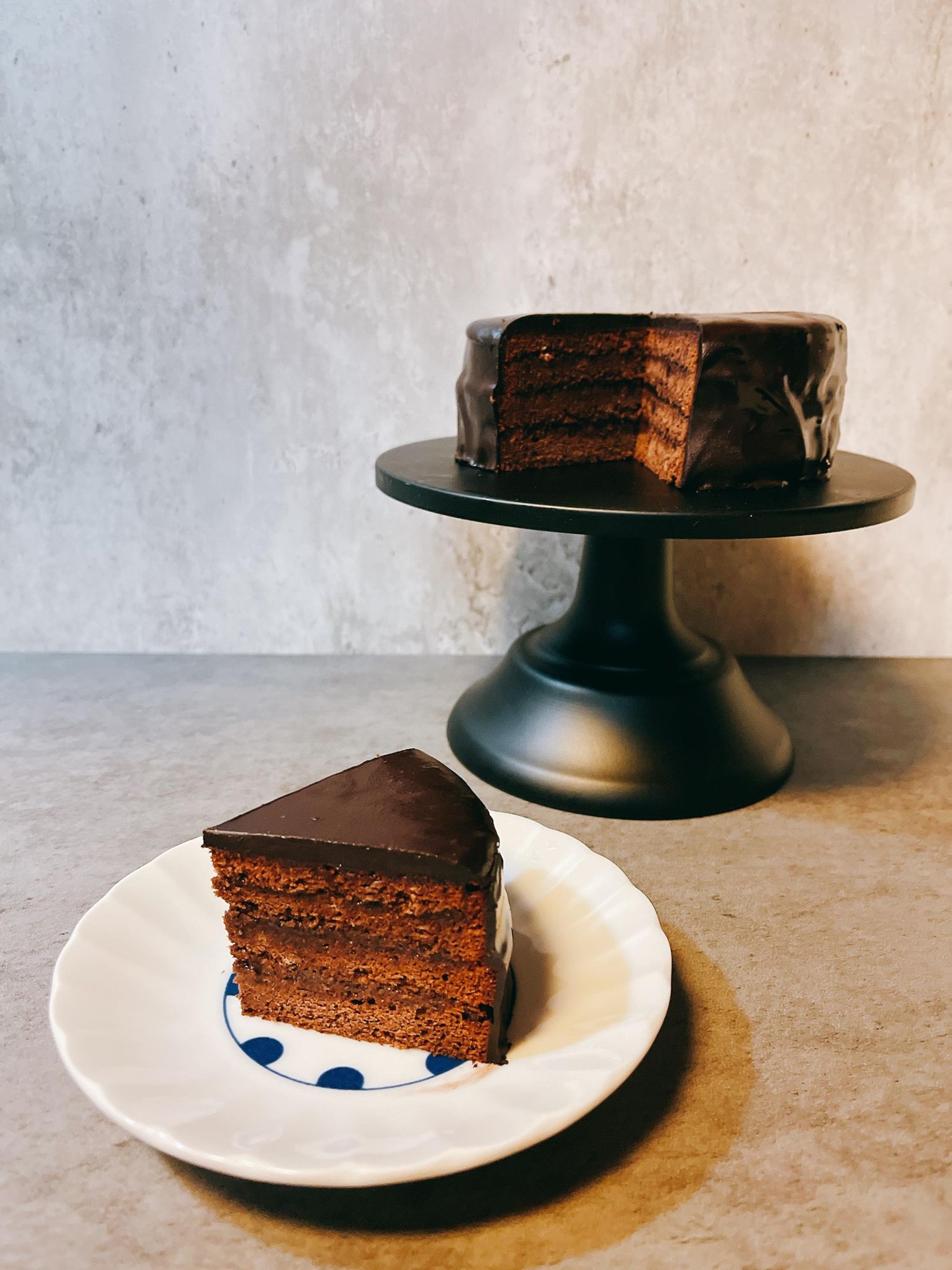 充滿濃郁香氣的巧克力蛋糕,內外抹上酸甜的杏桃醬,最後在淋上誘人的巧克力醬,