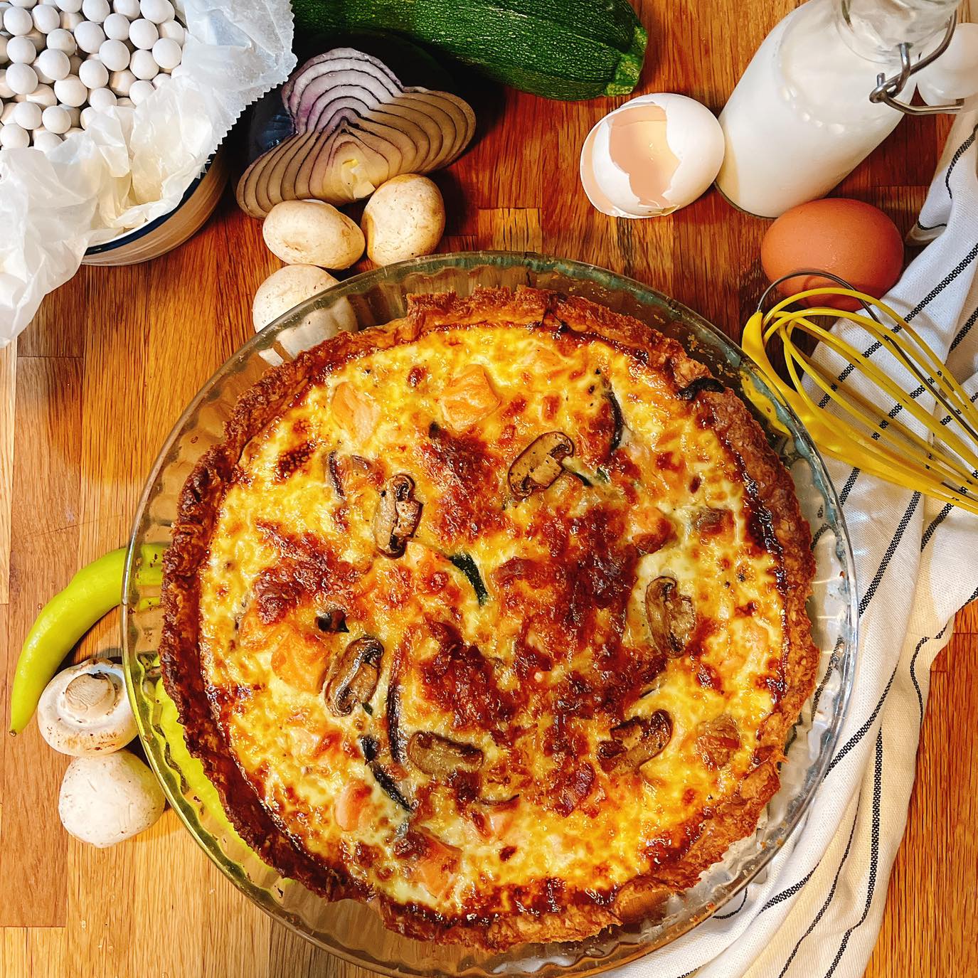洋蔥、蘑菇、櫛瓜、鮭魚、培根、起司,全部切一切,炒一炒,哇啦~乳香四溢會牽絲的Quiche鹹派