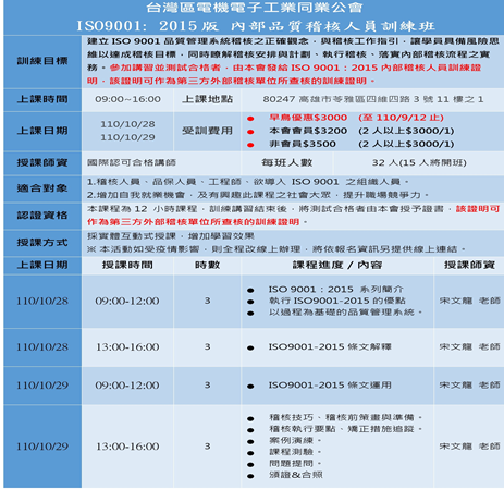 隨著品質要求的提升,國際競爭日趨激烈,產業將面臨衝擊與挑戰,永續經營是每一個責任企業者所需面對的目標。協助稽核人員持續發展專業能力,規劃應對稽核計劃風險與稽核實務作業之重點、技巧與運用,藉由稽核風險與問題的發掘以改善公司品質系統及運作上的缺失,以符合客戶要求及國際標準之規範,降低組織運作成本,提昇產品之競爭力!。
