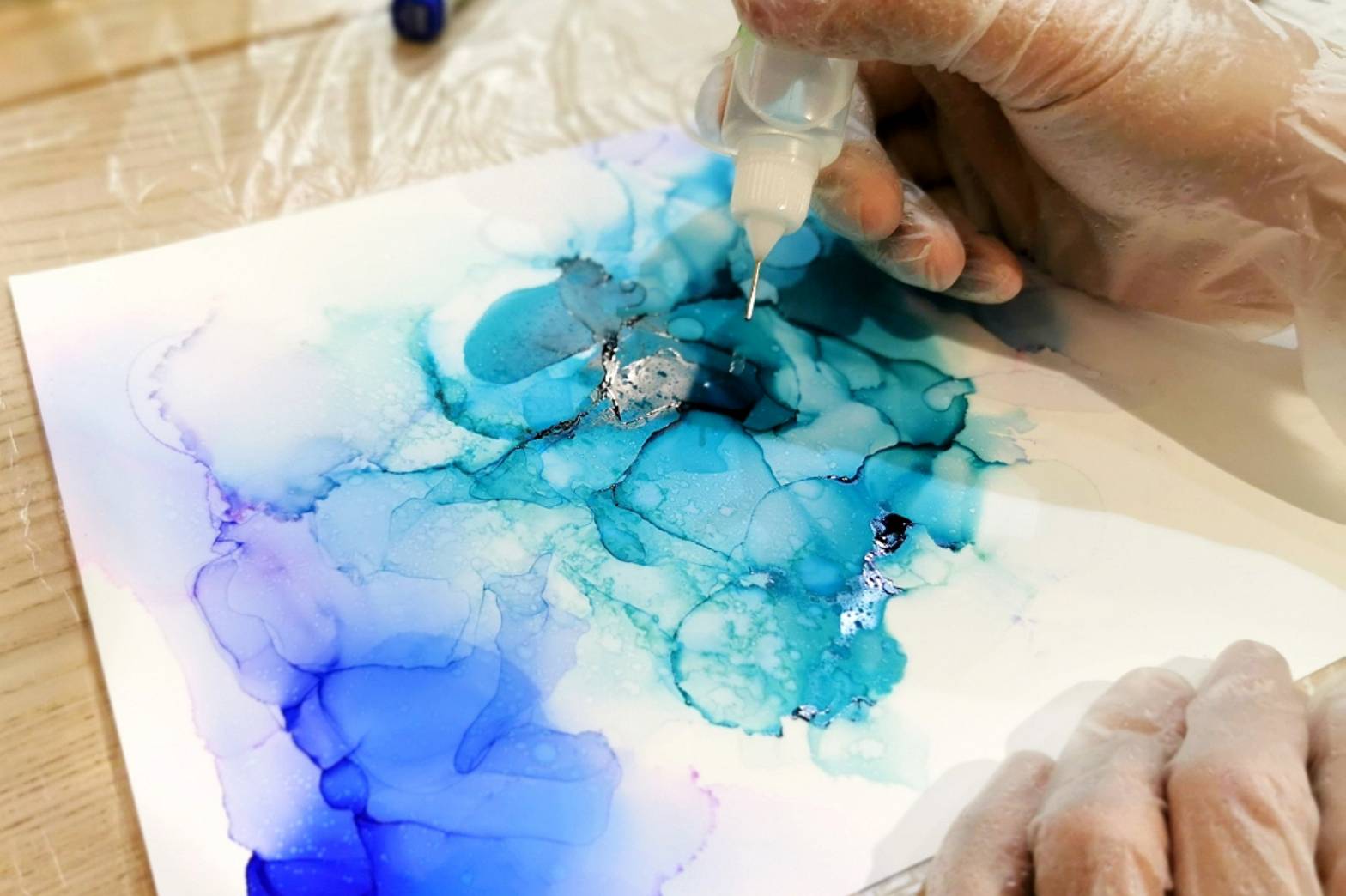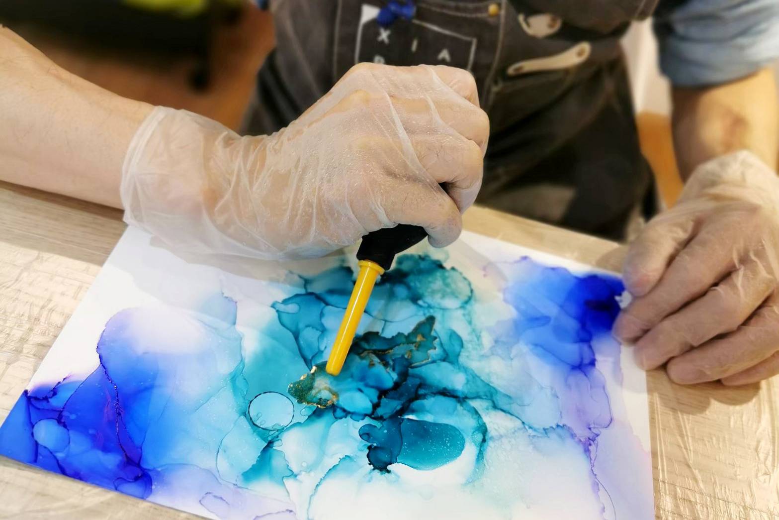 在老師的指導下,即使初學者也能輕易上手,即將彩繪出趣味豐富的酒精畫作。