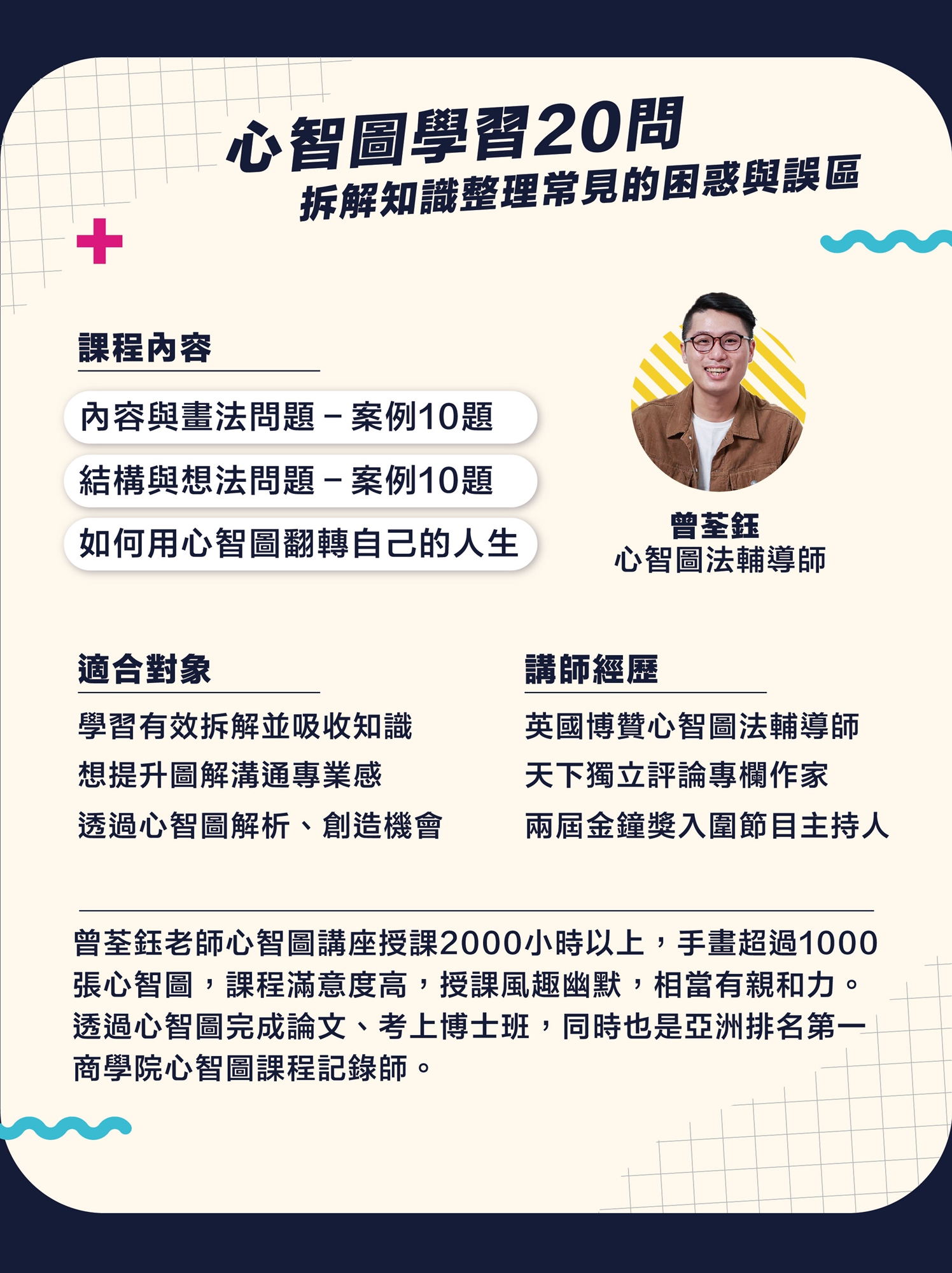 有人說:「這世界上80%的問題,在網路上都已經有人幫你回答了。」本次與職涯實驗室合作的「心智圖學習20問」線上虛擬教室同步課程,就是希望我們可以站在前人經驗的肩膀上,快速打破我們對心智圖的學習盲點與誤區。