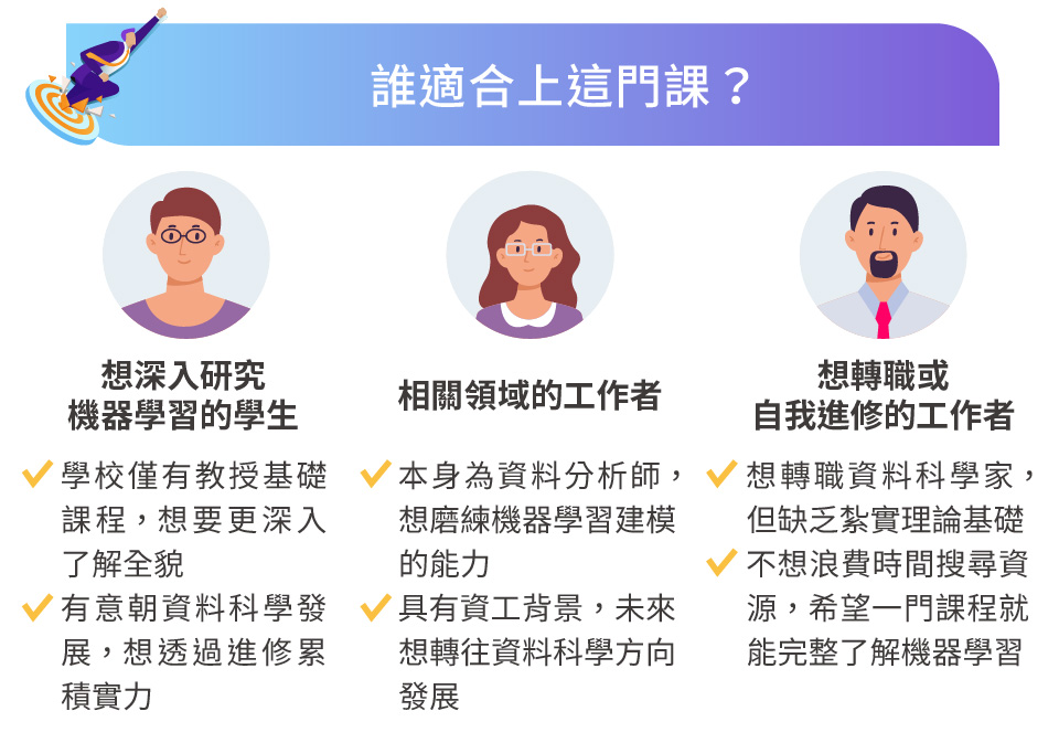 課程範例程式碼以 Python 語法為主,需對機器學習有基礎入門的認識,可參考課程試閱評估難易度是否合適。建議您能具備Python或其他程式語言初級以上的能力,或預習完成下列 Python 影片。- 莫煩Python3基礎學 shorturl.at/ouSV3