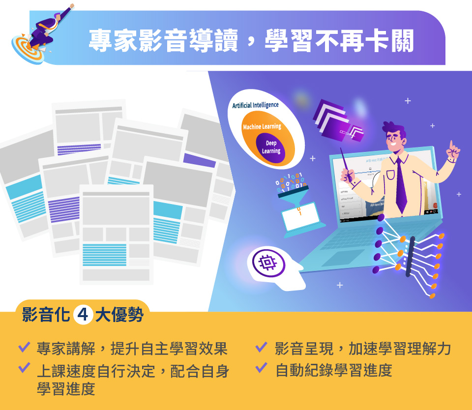馬拉松全面升級影音導讀,業界專家憑藉豐富的實戰經驗,幫你歸納出每日重點以及必學概念,更親自帶你完成範例與作業,打造高效學習環境,讓你的學習不再卡關。