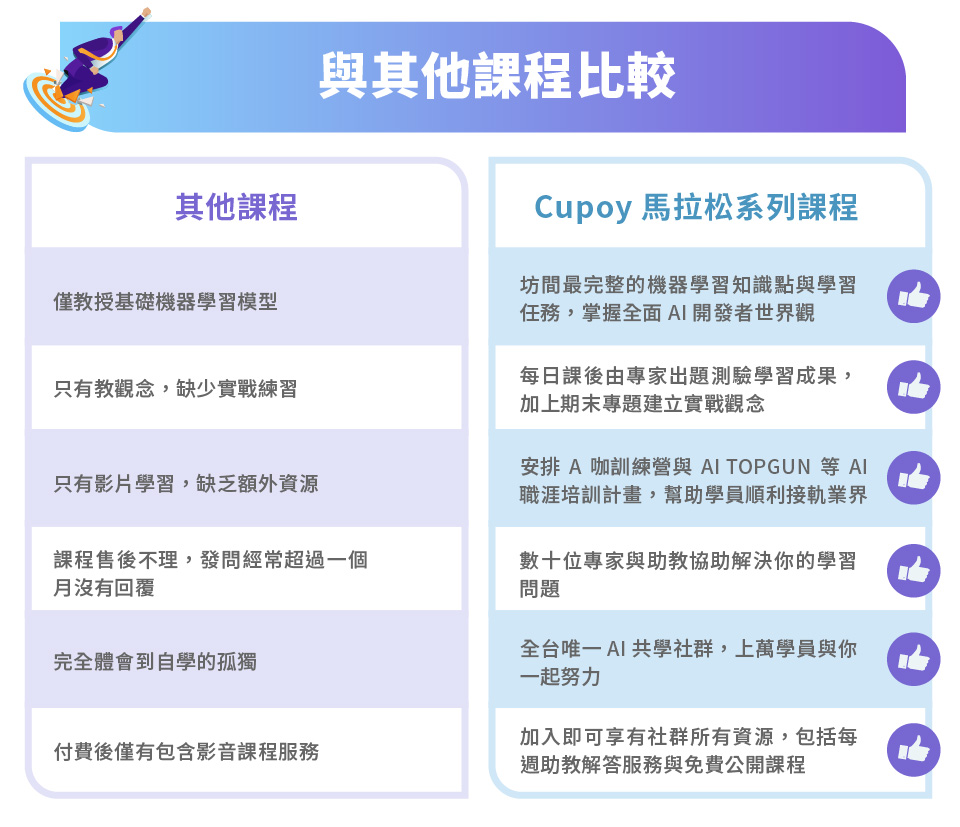 只要參與Cupoy AI學習馬拉松,你將可以與各種AI專家持續互動,永久有效