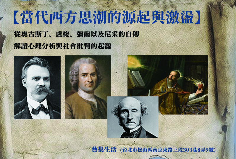 美國史家歐曼利(John W. O’Mallley)在其名著《西方四文化》(Four Cultures of the West, 2004)指出,洞悉時代危機的先知文化、企圖理解社會結構運作的學術文化、追求人類共善的人文文化,以及表彰人性尊嚴與根本處境的藝術文化,是形塑西方文明的四大支柱。這門課從奧古斯丁、盧梭、約翰彌爾、尼采四位哲人的自傳來解讀他們的思想如何繼受並重塑上述四文化,並將焦點置於他們如何採取自傳的書寫來一方面剖析人性、深入內在世界,一方面藉此批判傳統的壓迫與社會的不義,從而指向如何恢復本真自我的可能,重建個人與自己、他人、世界的關係並熱愛生命。