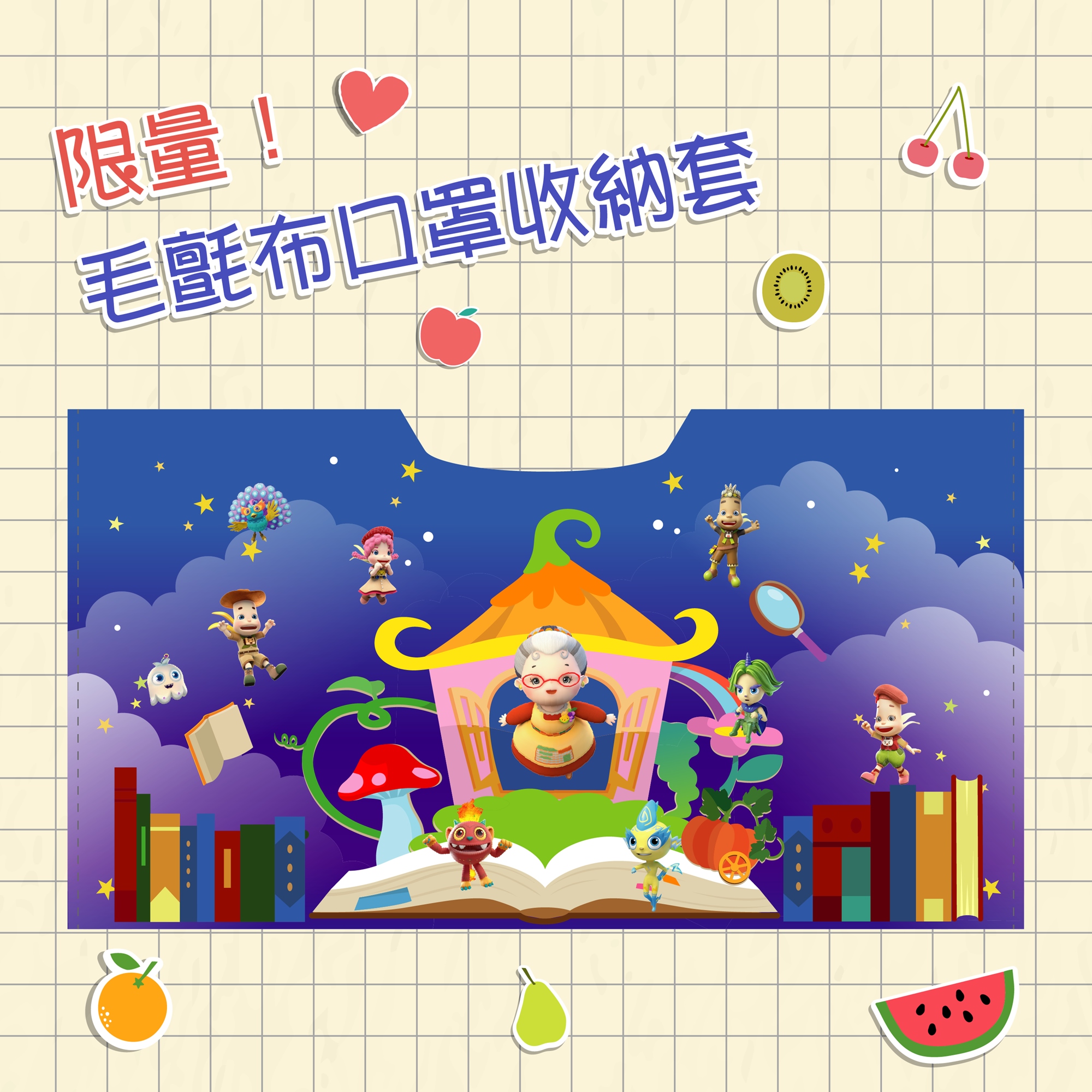 即可獲得「水果奶奶的大秘密-故事派對主題展」限量毛氈布口罩收納套!