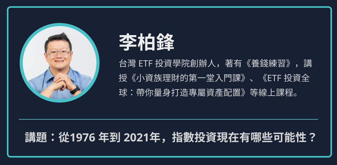 1976年8月31日,約翰柏格先生所創立的Vanguard成立了第一檔可供一般投資人投資的指數型基金Vanguard 500 Index Funds(代號:VFINX),開啟了指數化投資的時代,至今已邁入第45年,我們也特別選在 2021 年 8 月 31 日這一天舉辦台灣 ETF 投資年會,為Vanguard 500 Index Funds 慶生,也邀請到幾位重量級講者一同來分享,讓參與者可以一起更深入了解指數投資。