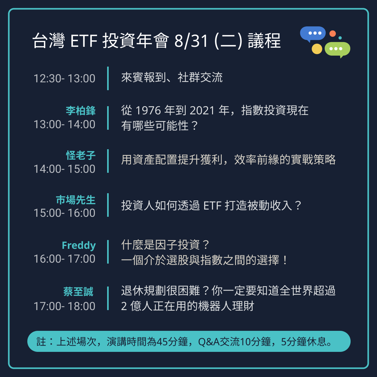 為此,我們精心規劃了這一屆的年會,透過幾個主題的安排,讓投資人可以從更多元的角度來了解 ETF 這個投資工具,並找出適合自己的投資目標,包含有目前台灣在指數投資上有哪些可能性?資產配置的策略如何提升獲利?想要打造被動收入該如何進行?什麼是因子投資?以及最夯的理財機器人如何應用在退休規劃?