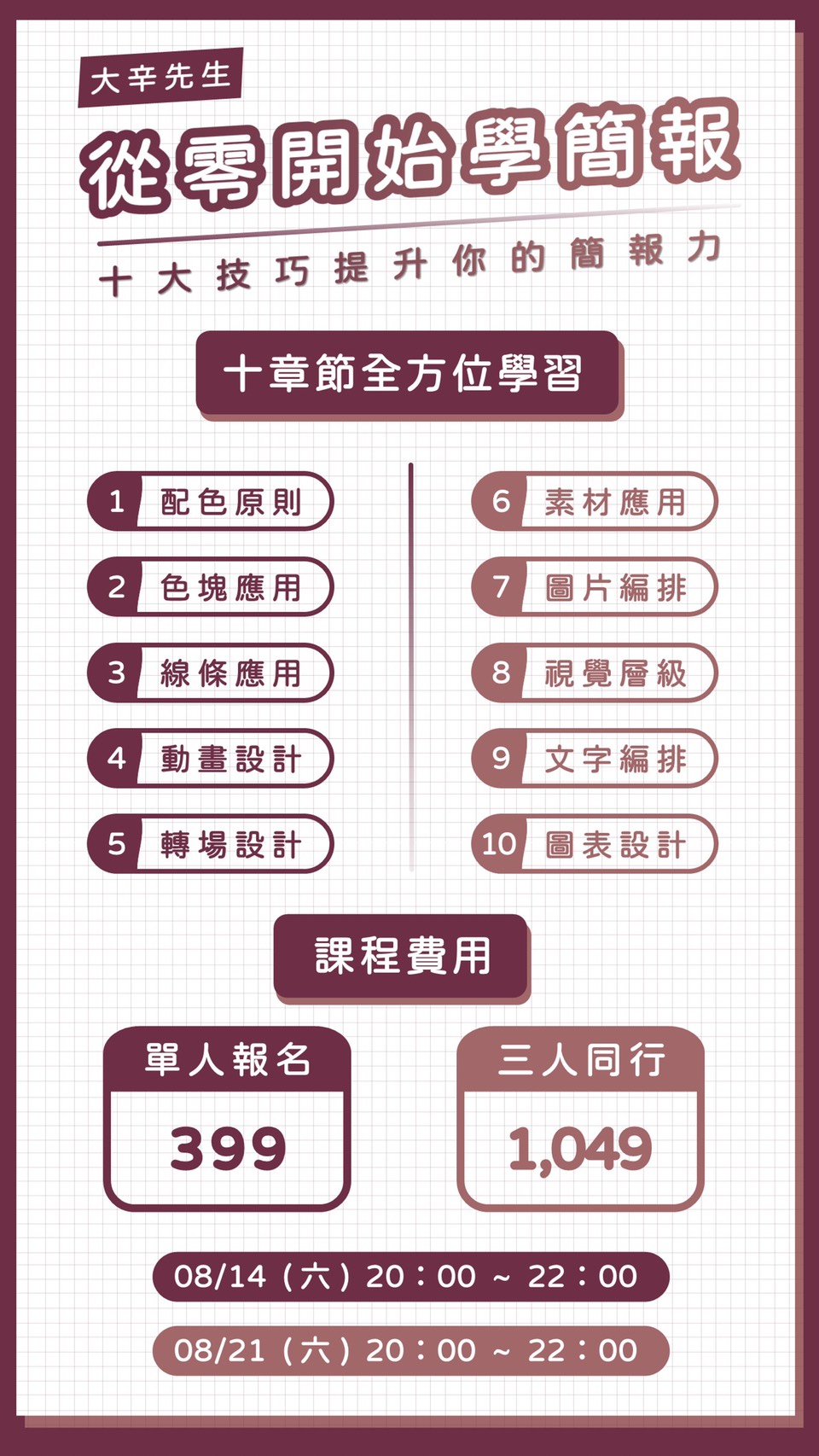 大辛先生是一名在IG分享簡報設計的社群創作者,從事各類型的簡報教學,現於工作生活家(微軟社群)擔任駐站圖卡師,擁有數十堂簡報課程經驗。