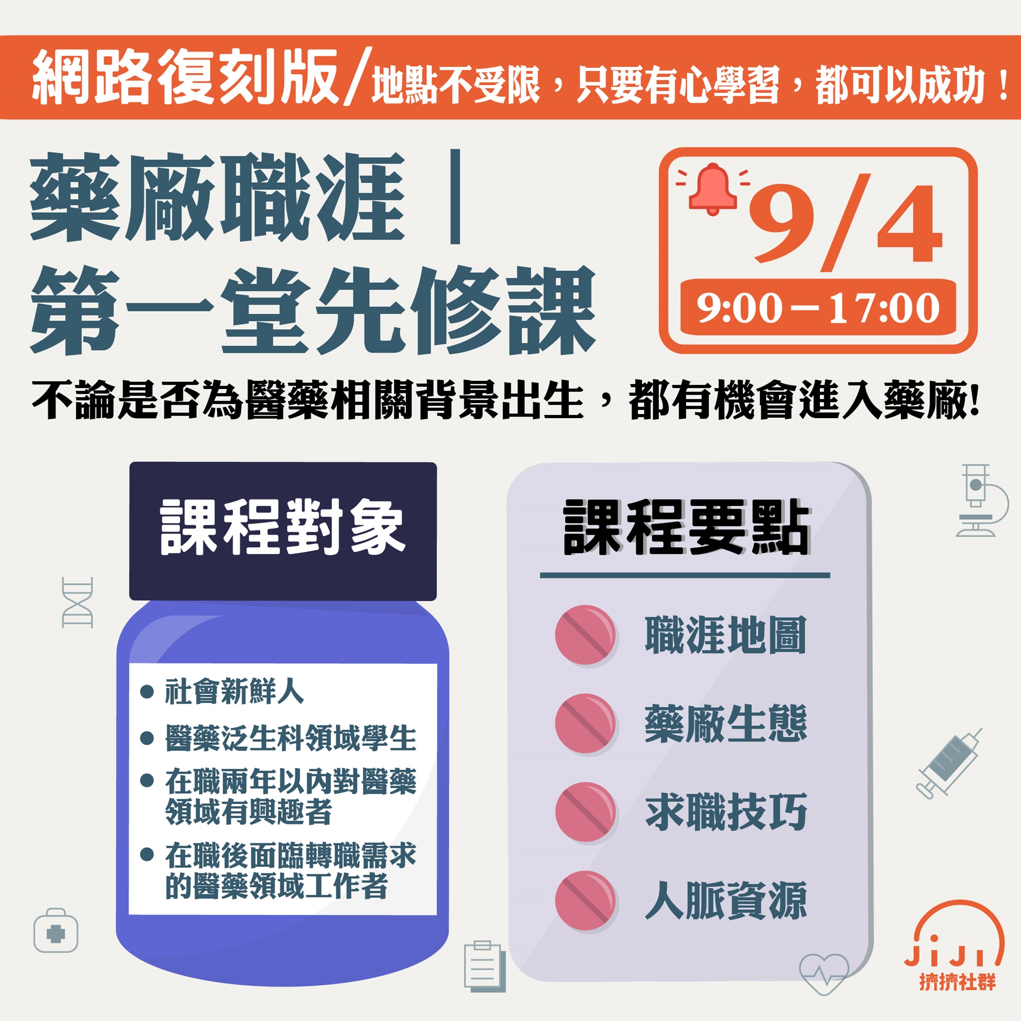 在這波後疫情數位時代,擠擠社群陸續收到來自各方的詢問,是否會再加開職涯課程,突破空間限制及掌握九月新學期開始、求職黃金月,延續上一期實體課程, 本次網路復刻版再度邀請到上一期優秀的講師們,另外也特別增加醫藥顧問課程的內容,分享為何離開第一線臨床醫師工作,轉而加入業界;以及產品經理課程內容,分享"Sales"與"Marketing"的差異,這兩位新講師的加入也完整了藥廠各部門的探索地圖,內容精采可期,千萬不要錯過!