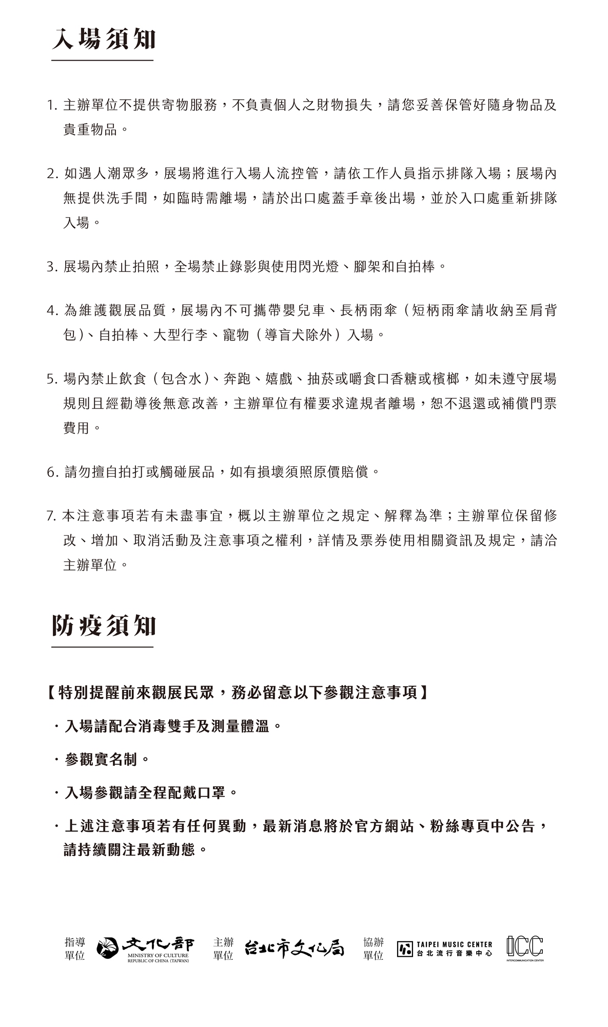 為維護優質的觀展品質,同時配合中央及臺北市政府防疫規定,展覽將實施人數管制,為順利觀展,請提前線上預約。敬請各位觀眾朋友配合,謝謝!