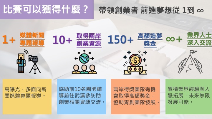 期盼發掘並支持具有潛力和創新力的創意團隊和新創企業,為創業團隊搭建平台,讓台灣年輕人創造更多發展及創業機會,藉由兩岸青年創業思維交流競賽,總獎金更高達約150萬台幣!!