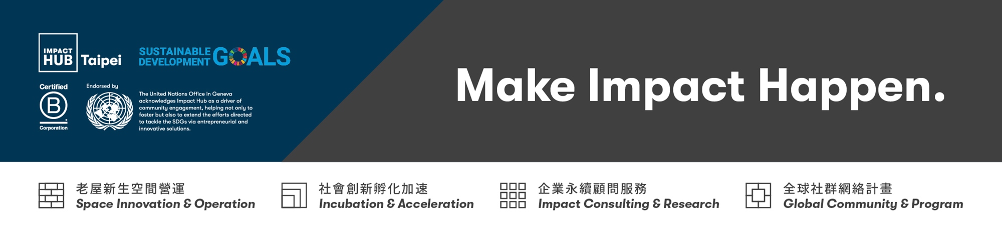 Impact Hub是全球最大的社會創新網絡,扮演著企業創新實驗室、社會創新孵化器和社群等多元的角色,更是一個提供會員各種資源、靈感、合作機會與擴大社會影響力的獨特生態系統。Impact Hub Taipei於2015年成立,是華語世界第一間Impact Hub,也是目前亞洲第一間獲得B型企業認證的Impact Hub、台灣第一間通過B型企業認證的共同工作空間與影響力孵化器。在台灣以「老屋新生空間營運」、「社會創新孵化加速」、「企業永續顧問服務」、「全球社群網絡計畫」為主要服務面向,並成功將營運「Impact Hub Taipei」共同工作空間場域、創新創業社群、孵化與加速的成功經驗複製至「台北NPO聚落」,持續創造對全球永續發展的正面影響。