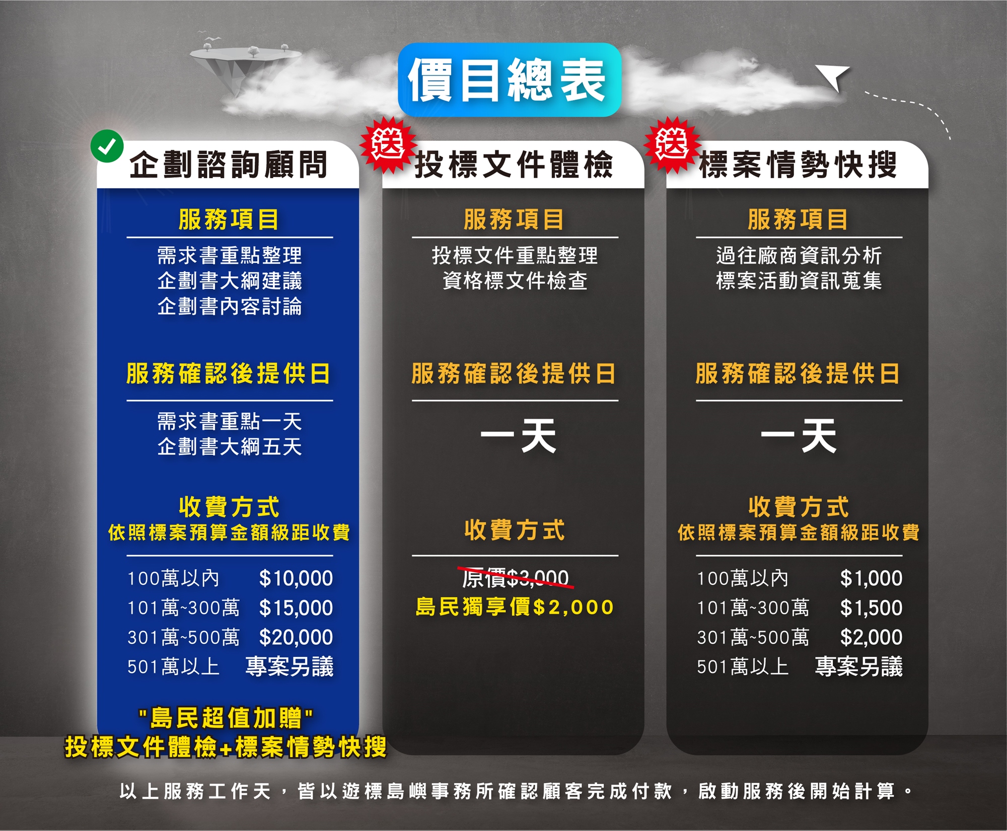 👉島民購買企劃諮詢顧問服務加贈:投標文件體檢服務(想進一步瞭解,請點選服務傳送門)