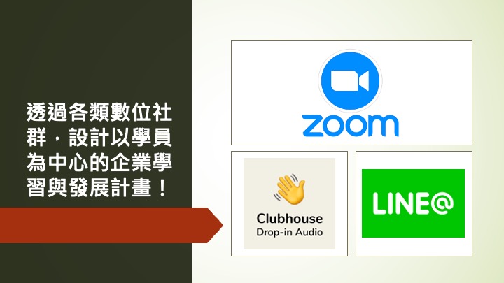 本次線上研討會,讓我們來聊聊企業如何透過各類數位工具,進行以學員為中心的企業學習與發展計畫,且打破空間及時間的界限、零距離的運用! 1. 線上互動教學軟體:Zoom 2. 主流數位社群工具:Clubhouse、Line官方帳號 3. 微學習短影片製作:手機、免費app |