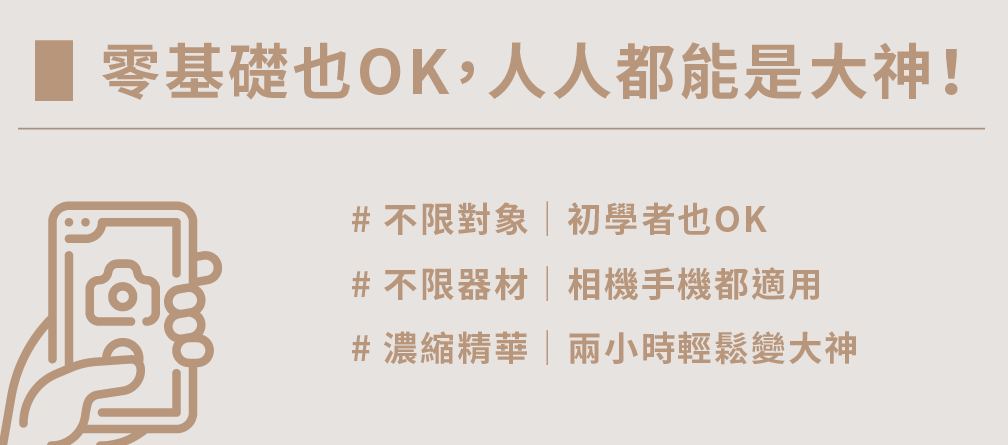 這是一場最適合所有人的手機攝影講座,短短兩小時就能開啟你的大神之路,除了最精華的講座內容外,參加者還可以獲得大神親手調配的『Lightroom唯美風格濾鏡檔』,用濾鏡打造屬於自己的專屬照片吧!