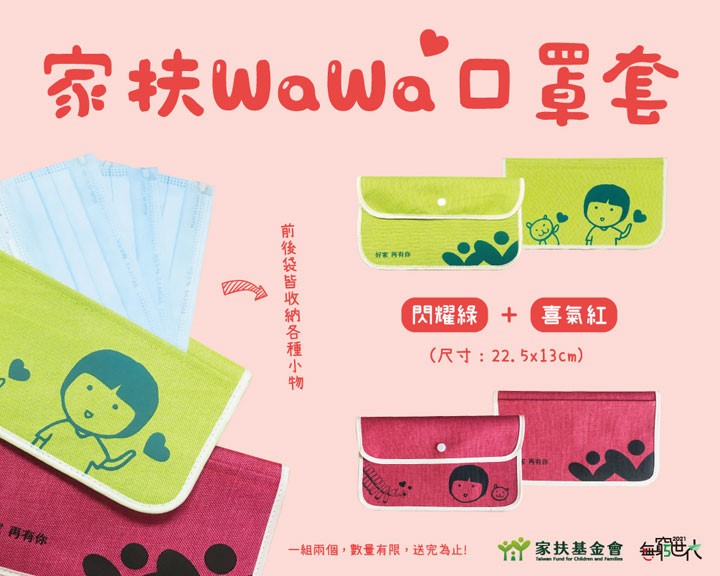 即日起單筆捐款滿1,000元,即可獲限量「家扶WaWa」口罩套乙組(兩個),送完為止。