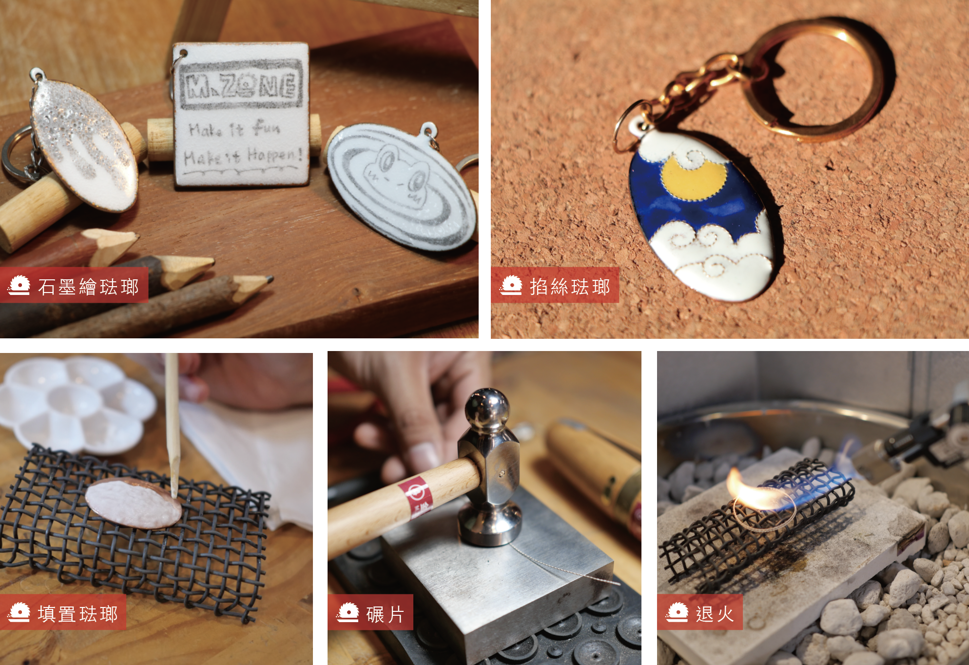 課程將透過「石墨繪琺瑯」與「掐絲琺瑯」之燒製技巧,學習使用高溫爐及控制其溫度。「石墨繪琺瑯」運用鉛筆,手繪圖樣於琺瑯上,創作出素描質感;而「掐絲琺瑯」則利用銀絲線在面盤上,框出線形輪廓,再填入琺瑯釉料,打造細緻線條,學習創作出各式進階的琺瑯作品!