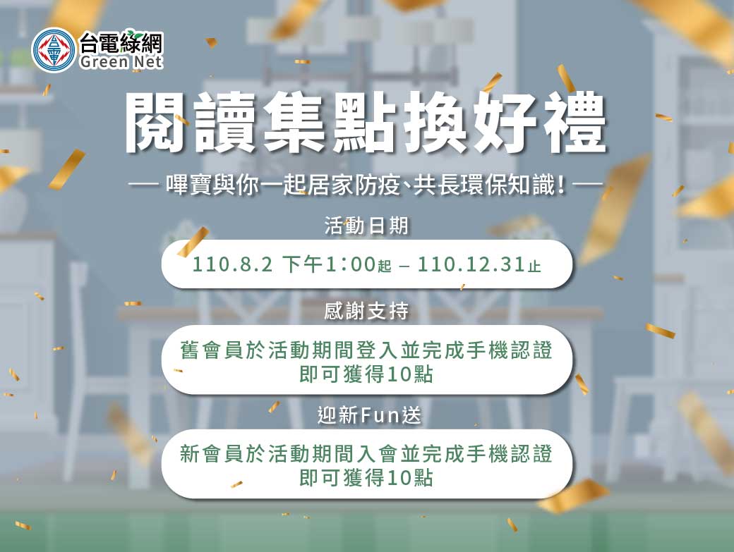 為陪伴所有綠網會員共度防疫生活、也感謝您對環境保護的關注與支持😍,即日起至12月31日,台電綠網推出 會員集點換好禮 活動,只要完成指定任務累積點數,滿額即可兌換 超商禮券、Line Point等超多豐富禮品🎁!