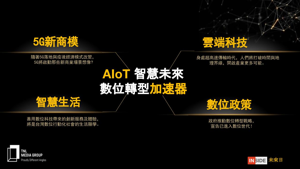 INSIDE 邀請產、官、學界的意見領袖共同與會,從數位發展政策出發,探討與 AIoT 產業發展相輔相成的 5G 新商模,更進一步邀請國內重磅企業大方分享它們的 AIoT 數位轉型之路,包括:它們曾經遇到的困難與挑戰、關鍵決策點、以及最終如何運籌帷幄,藉由不同的解決方案、技術,提升企業營運效能、和同業拉開距離!