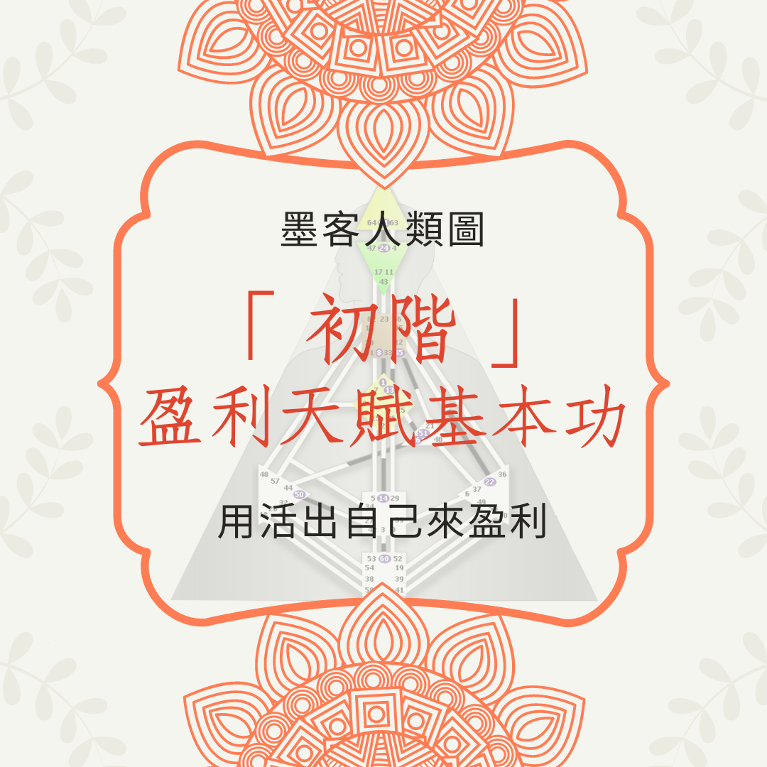 上完讀圖心法、零階的各位還好嗎?接下來,就是時候來認真面對自己了。人類圖在談論的,是你真正的本質,而不是在「外面」的那些有形與無形。我們選擇在物質世界成長進化,故在地球得此肉身。因此,運用這種精妙的邏輯區分來釐清「在工作賺錢的那個我是誰」,將是本階的重點目標。這絕對是一個重大入門:進入自己真正設計的大門。若能妥善運用人類圖,就不容易被物質綑綁而成為「半死不活」的人;也不必為了進化而屏棄物質。就讓我們在初階共同探索進化與盈利的美妙設計。