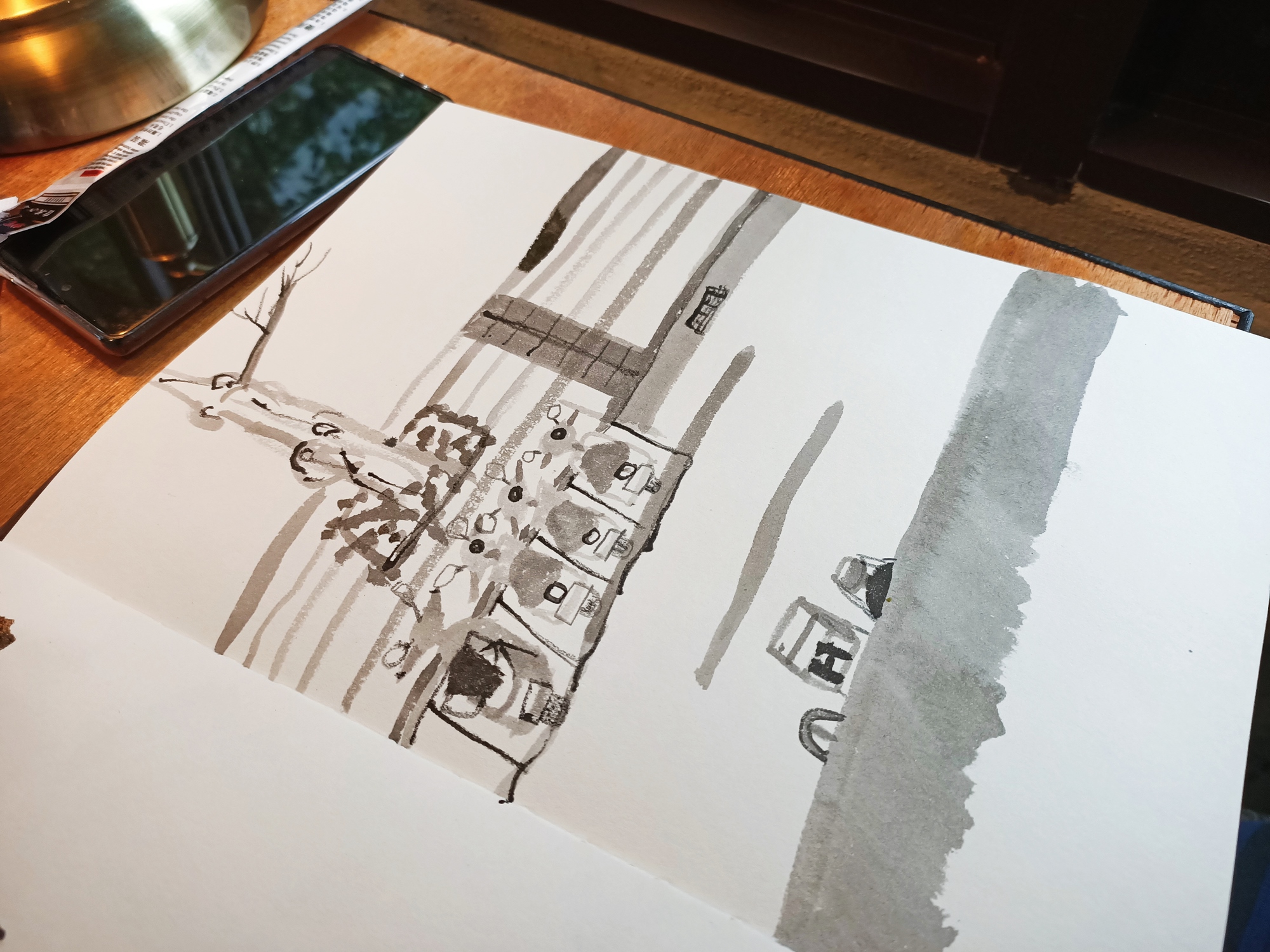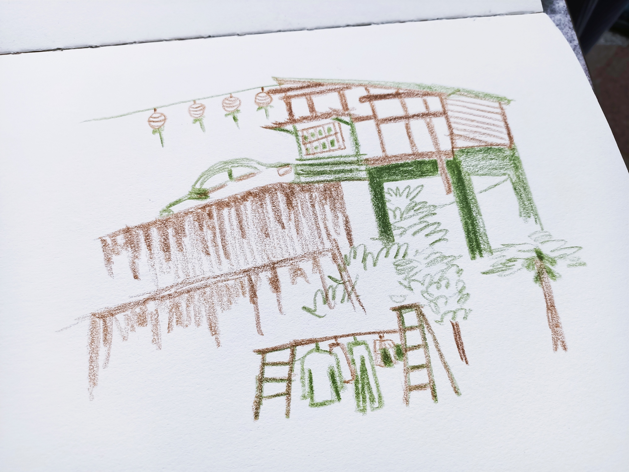 ➤前2個小時會帶著學生從零練習怎麼觀察,並使用自己手邊帶來的筆暖身與熟悉怎麼從近的東西到遠的場景構圖,目的是要帶學生活用自己手邊的素材,因為有些人可能有很多媒材卻不知道該如何使用,增加自己日常可以隨手練習畫畫的容易度。