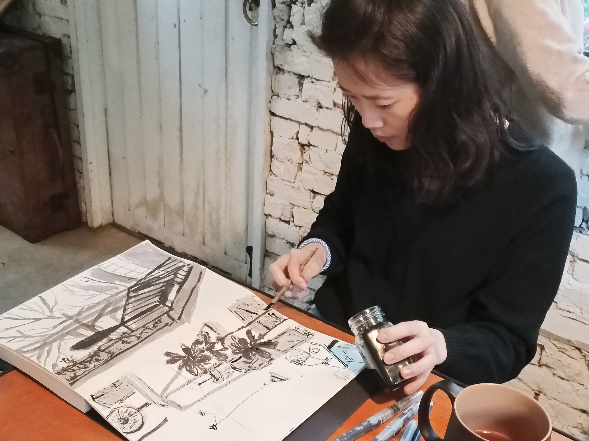 ➤後2個小時會用老師準備的素材,包含裝了3個不同色階的墨水水筆以及樹枝筆來練習玩線條的多變性。插畫的基礎來自線條,而線條的粗細、流暢、速度的不同都會帶出多元的感受,我們會在過程中體驗到在精準(前半段)與失控(後半段)間如何找到平衡的感覺,使我們增加插畫最基礎的彈性理解。