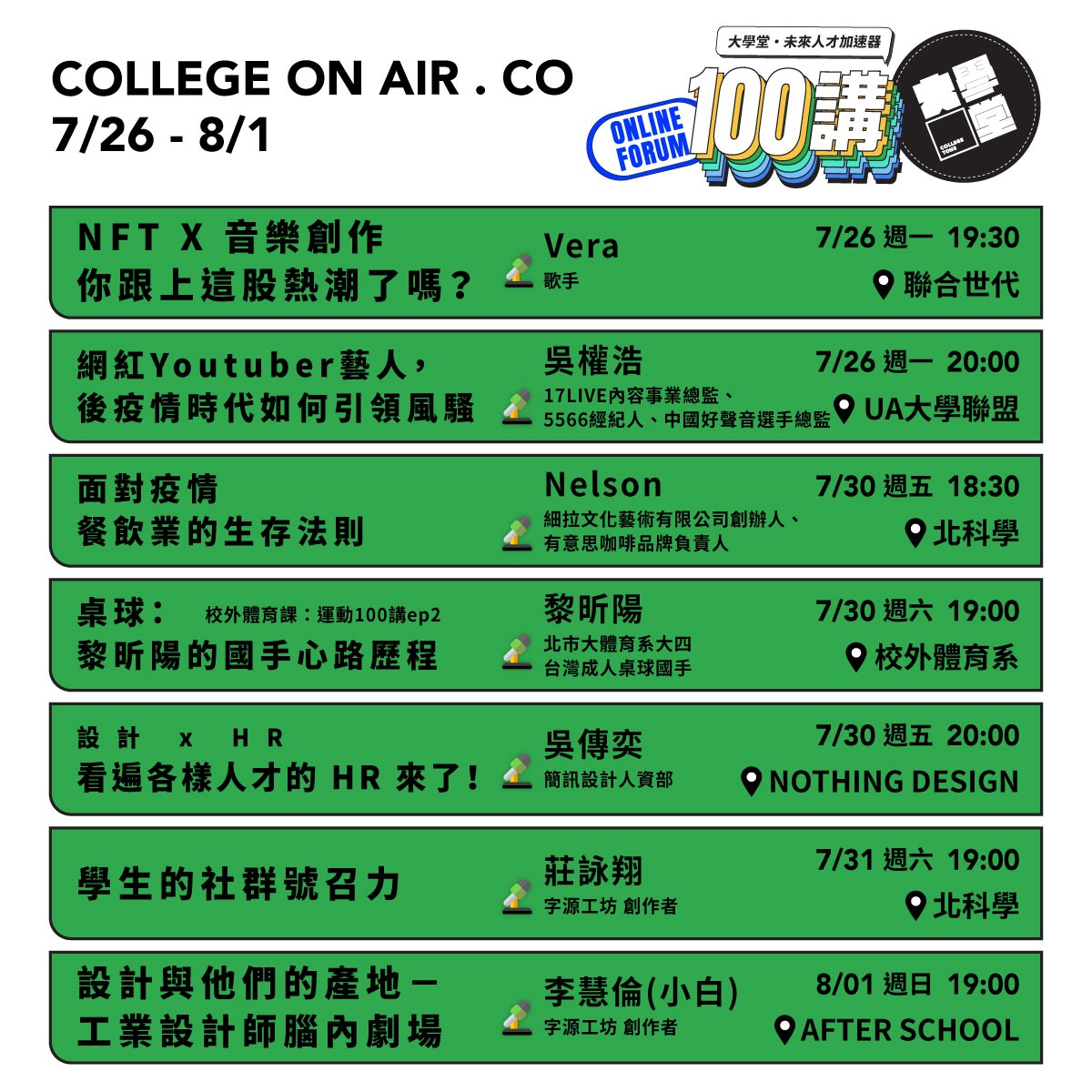 |論壇資訊|7-9月,串聯 #8個大專社群品牌 、透過 #5新趨勢領域、#9週線上論壇,邀請各趨勢專家、學生新創人才線上一同交流分享!