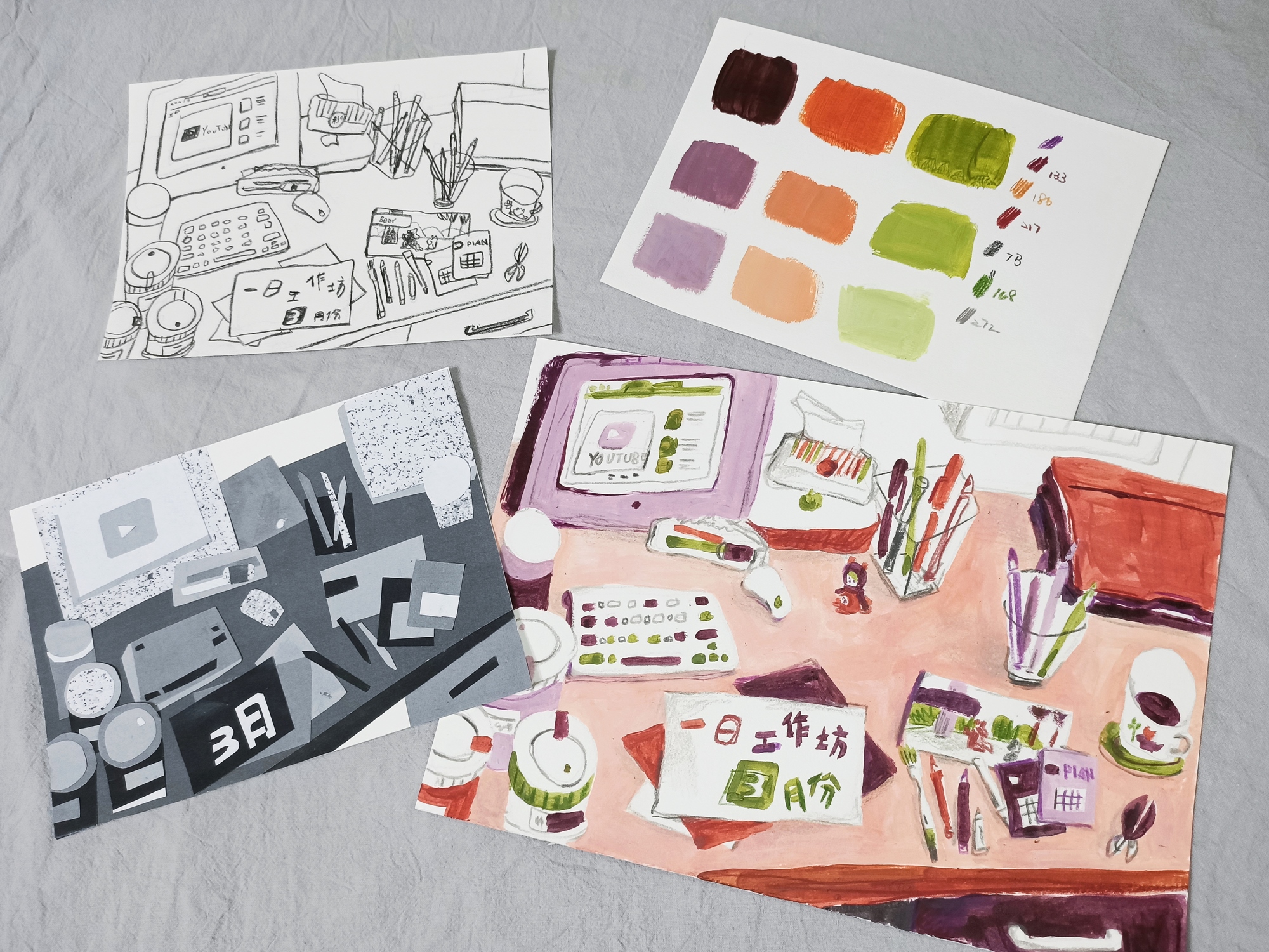 是否有時候在畫草稿時會覺得自己草稿畫得很棒,但開始上色時就覺得自己毀了要完稿的作品,而一切都要從完稿前的各種多元的縮圖構圖練習,練習不同的色彩配置、媒材結合,最後再完稿。
