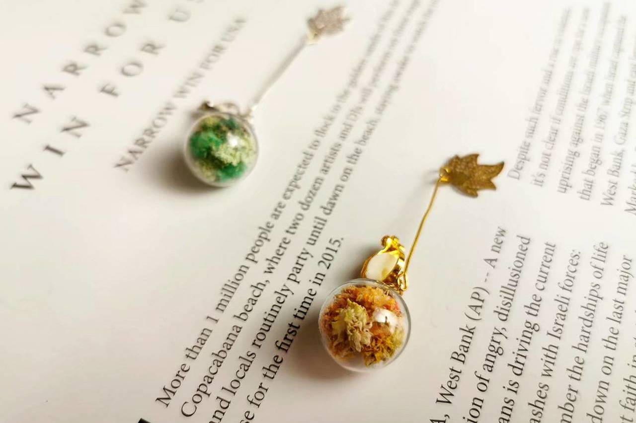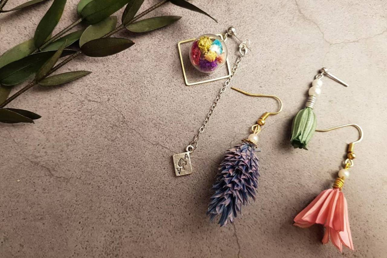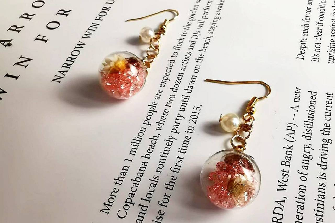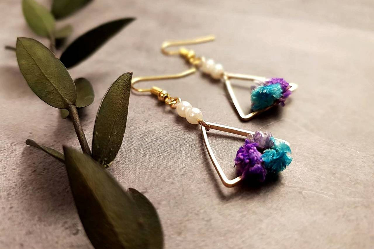 手作乾燥花耳環,透過老師帶領下,可以挑選,對自己賦有意義的花色,進而與其他零件結合,拼裝,自己做出最美的心中耳環。