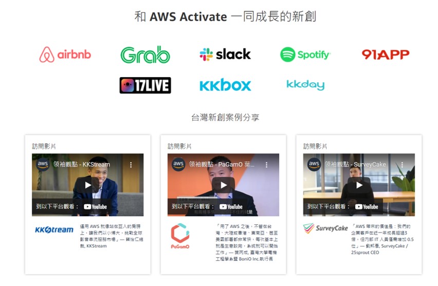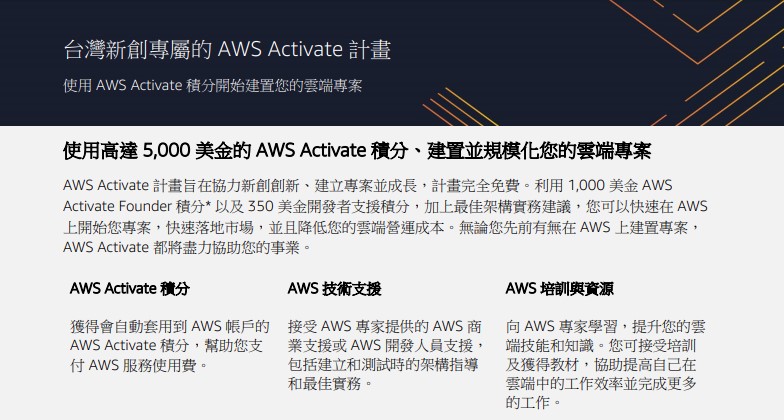 AWS Activate 台灣站: https://pages.awscloud.com/TW-CHT-Startup-Activate.html