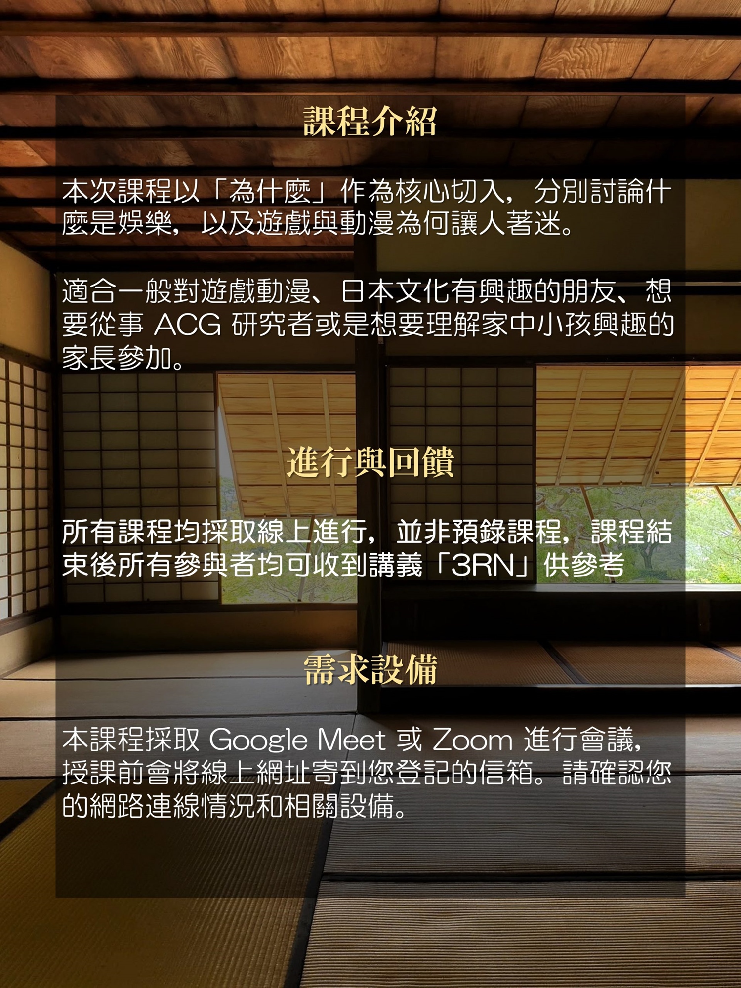 3. 請確認您在購票時登記的 Mail 正確,我們將會以此作為發送課程連結的依據。課程原則上將使用 Google Meet 進行(zoom 作為備用,若有資安疑慮者可選擇使用 Google meet),煩請先確認相關設備。