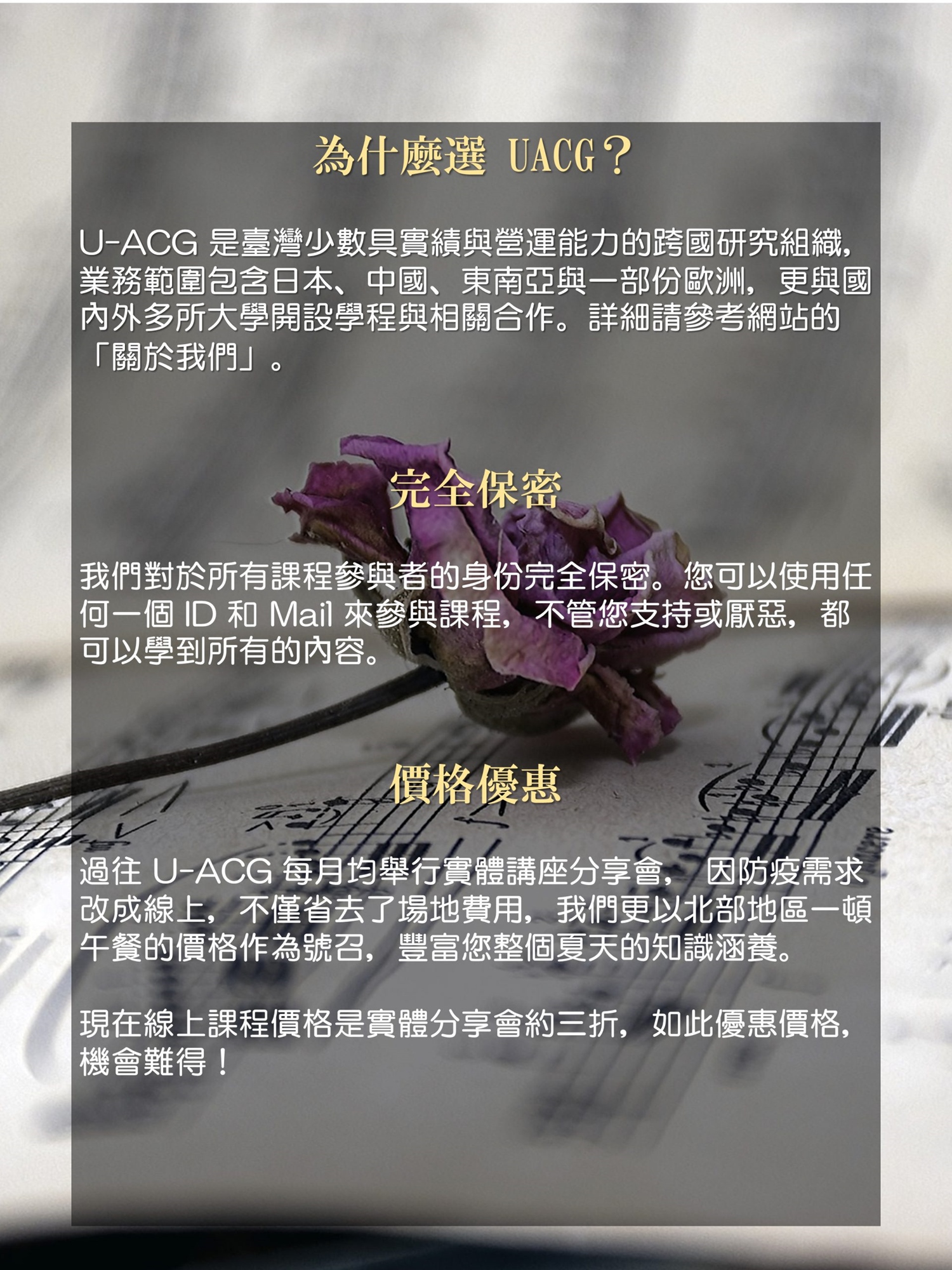 7. 課程將有錄影,如果您錯過了當週課程,均可以在事後申請課程錄影觀看;如果您購買的是講義版本,將會在課程結束後一次寄發到您的 mail。