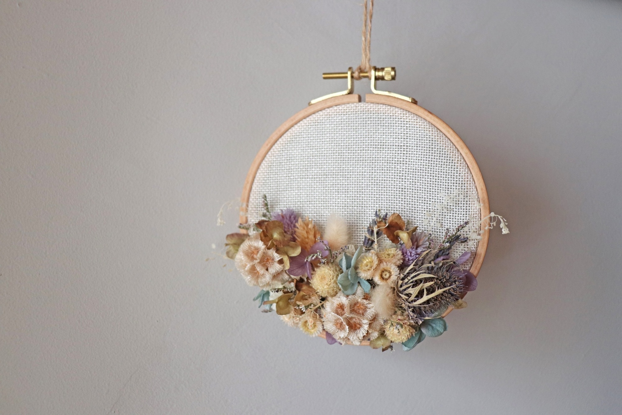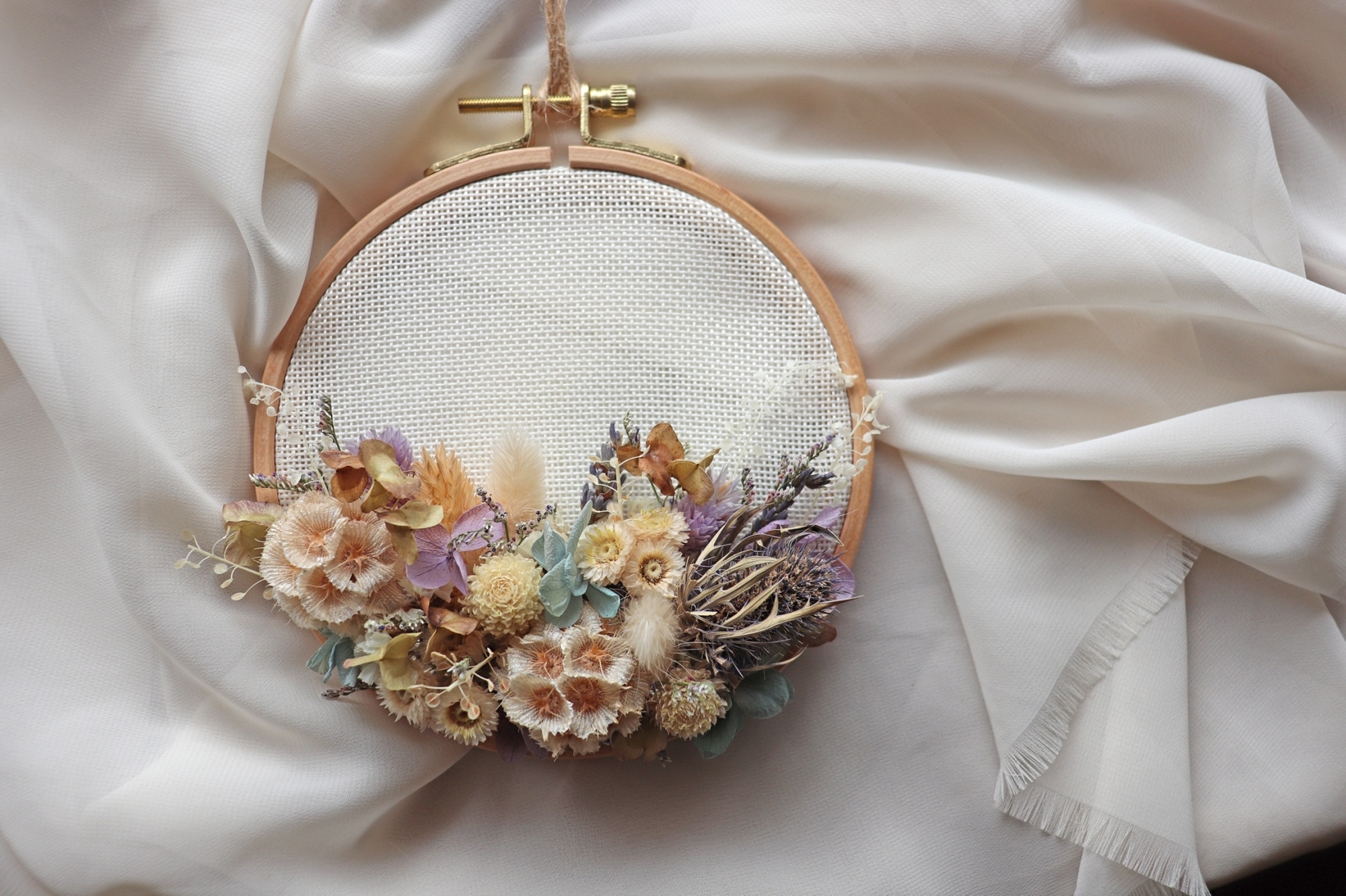 A:材料包內含 → 木質繡繃、繡布、各式乾燥花材、麻繩、課程專屬精美小卡