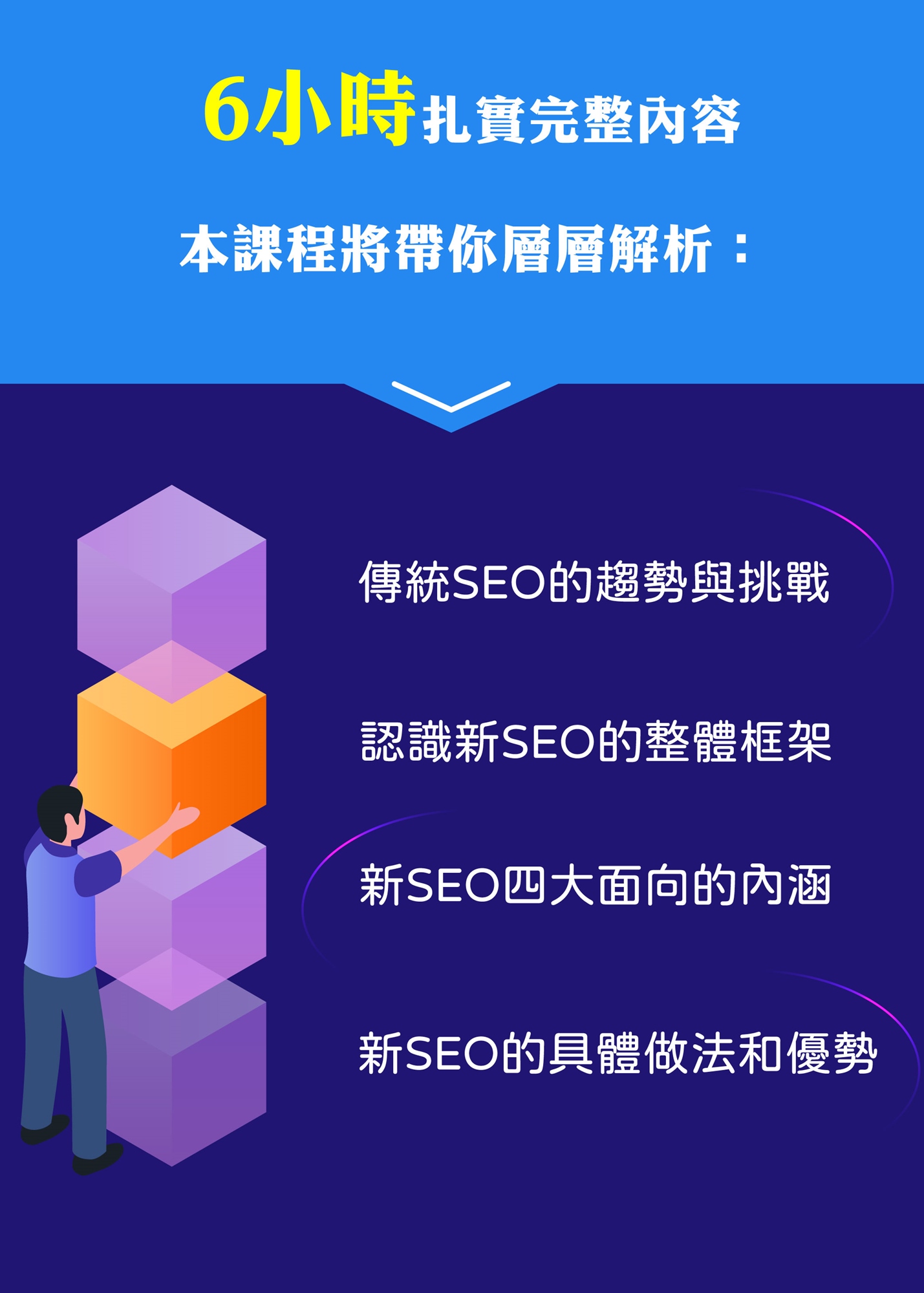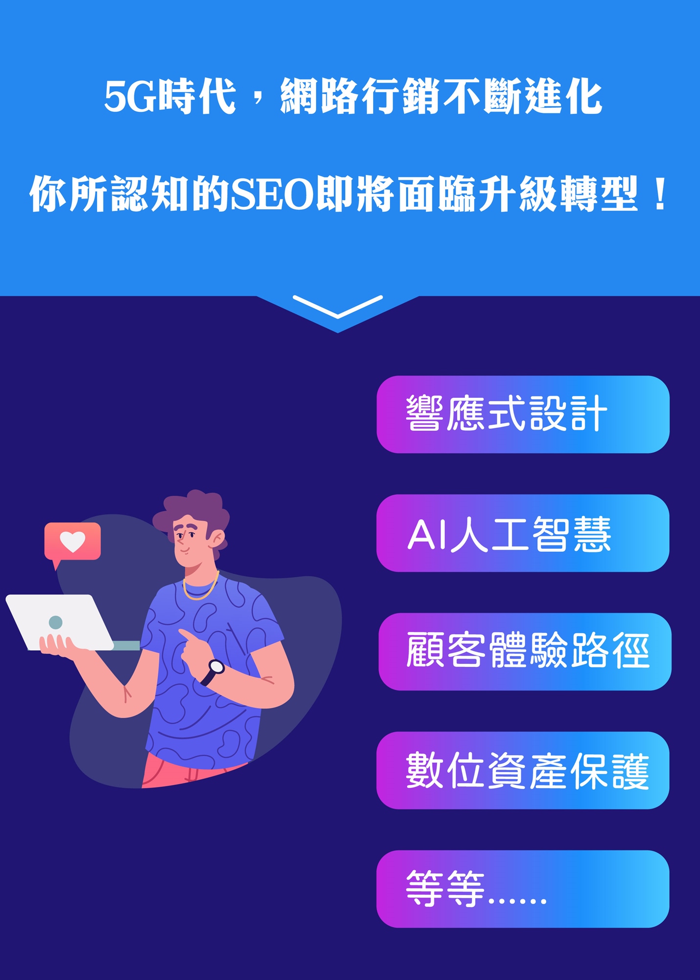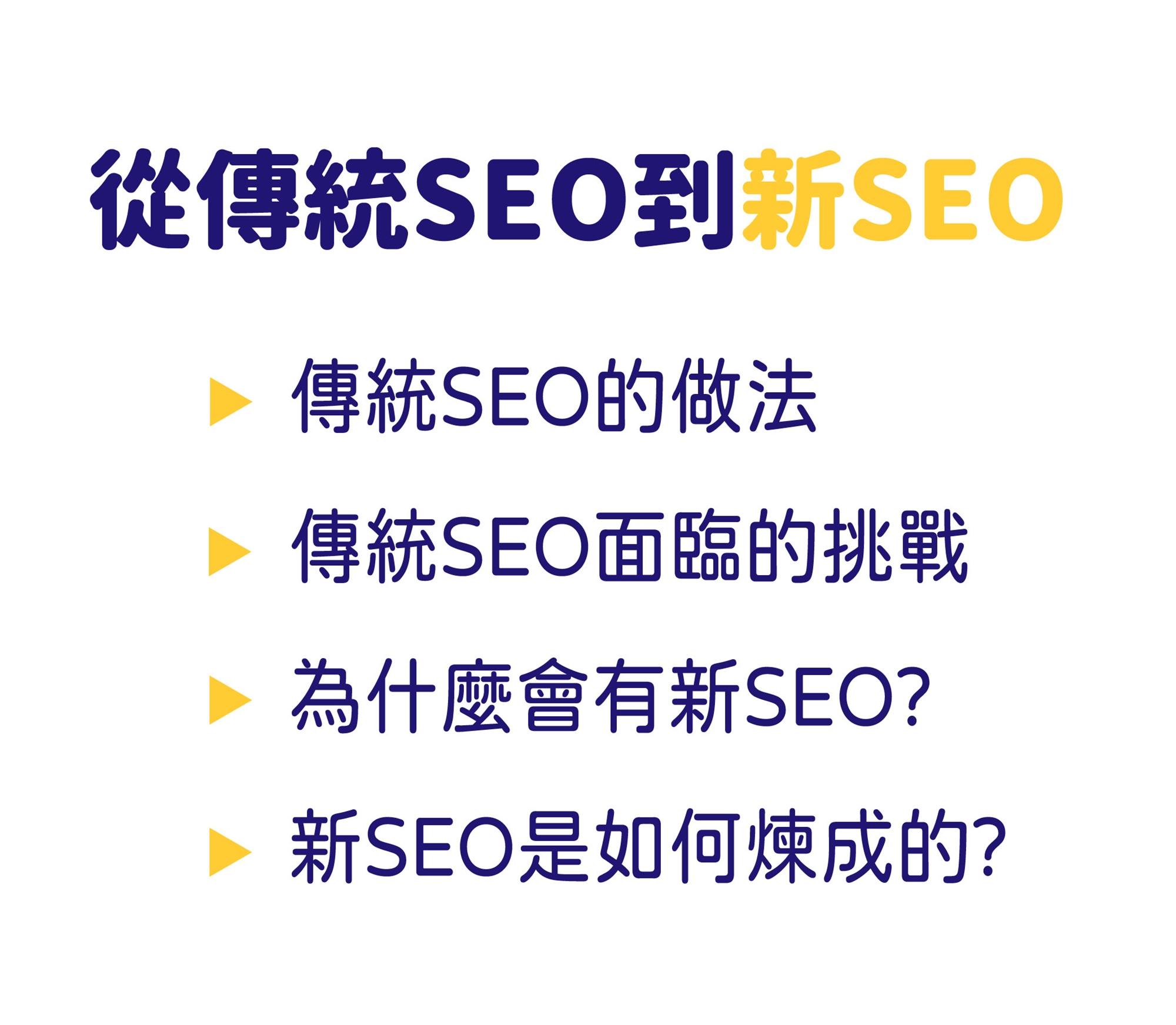 隨著社交媒體、內容行銷和行動上網的興起普及,追求網頁能見度的搜尋引擎優化SEO,將因5G、AI人工智慧的時代到來,即將面臨升級轉型!針對趨於多元的用戶、行動裝置、情境、內容呈現方式及傳播管道,做好新時代SEO的佈局,將會是所有經營者、創業者、行銷人員必須抓緊腳步學習的課題