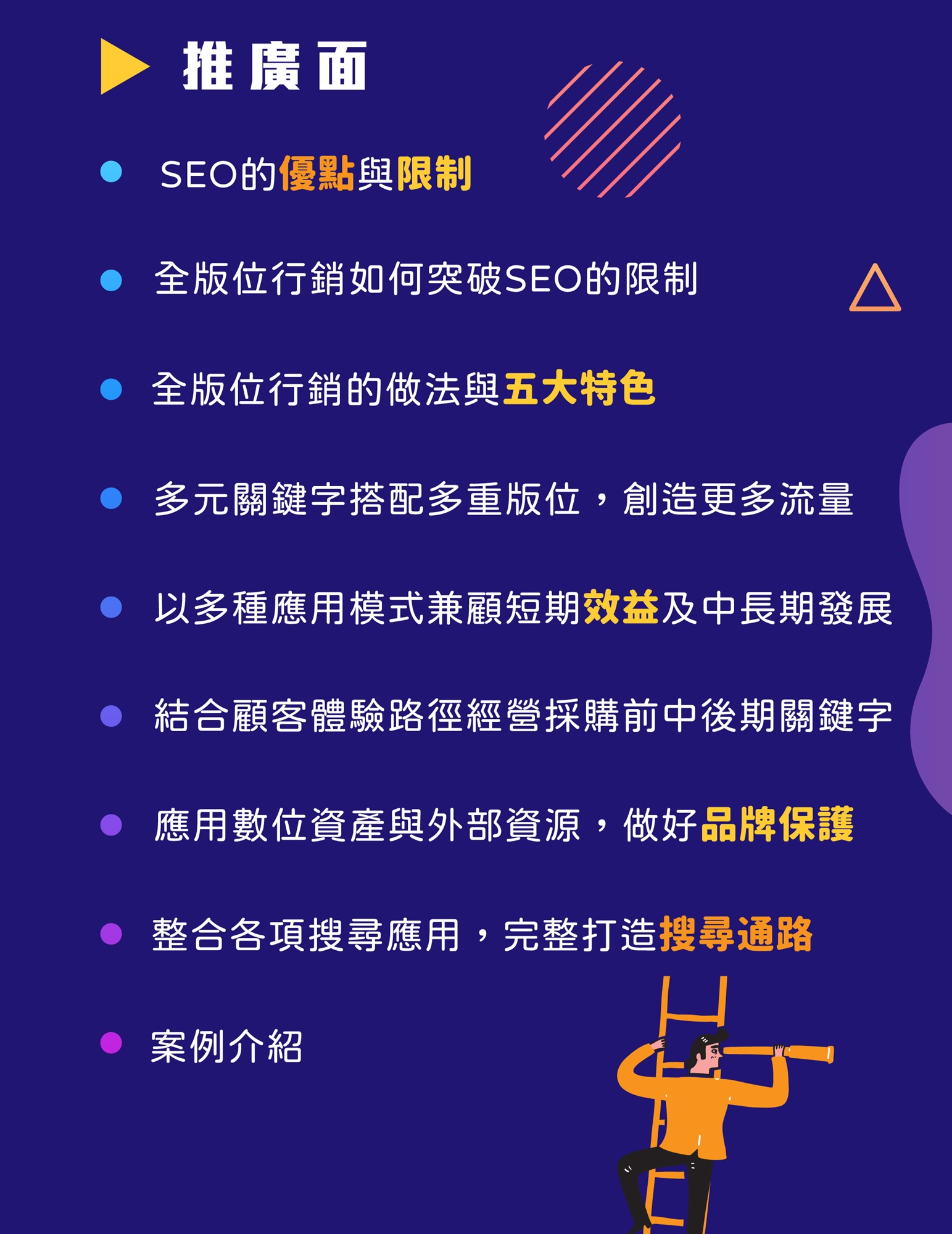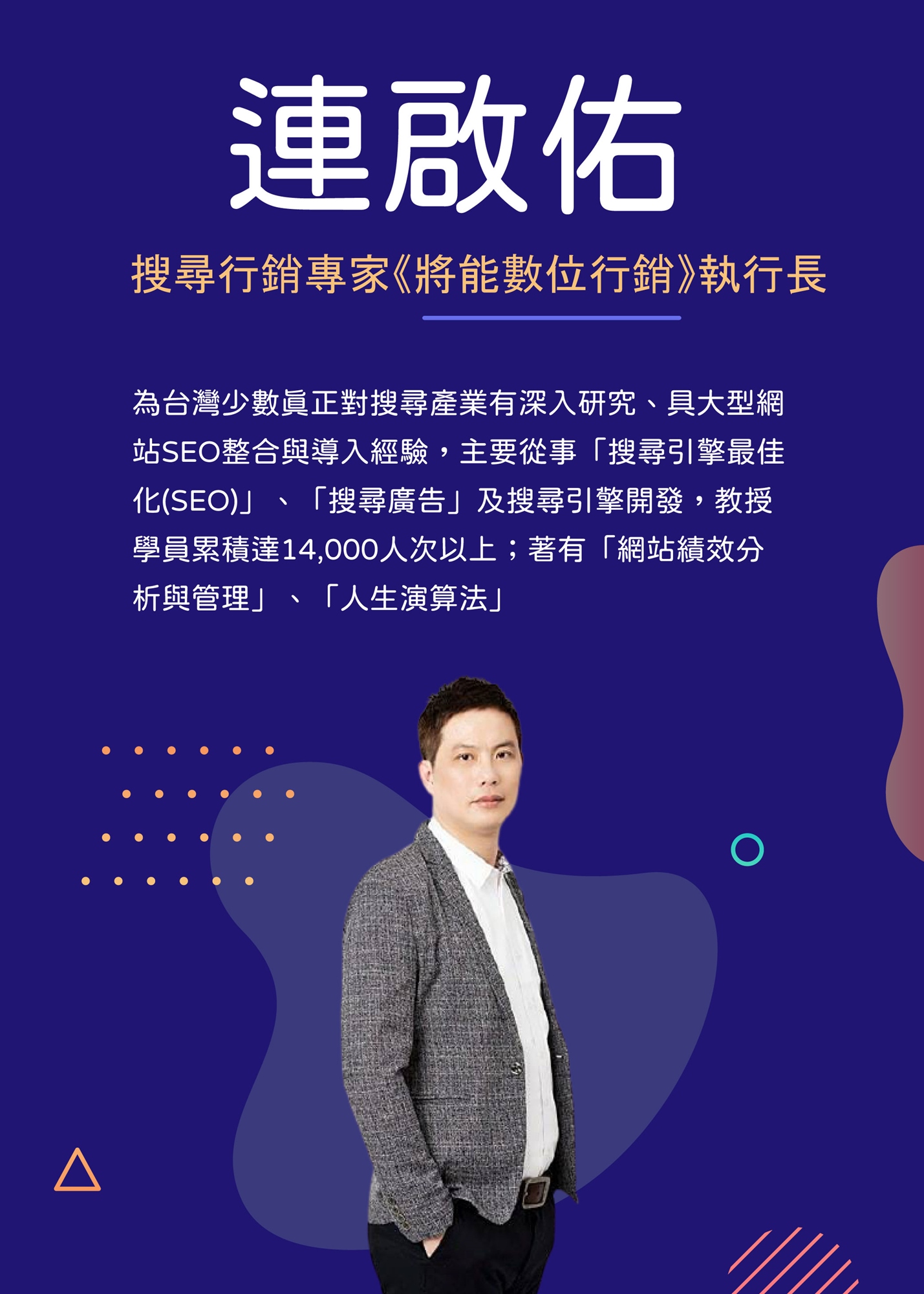 搜尋行銷專家《將能數位行銷》執行長--連啟佑老師,將整合多年來,於業界顧問諮詢、教授與實務執行的經驗與心得,介紹新思維、新作法,幫助企業因應SEO最新技術趨勢,結合顧客體驗路徑,並透過數據分析發現增長機會,藉由多版位行銷觸及客戶、擴大客源,完整打造搜尋通路