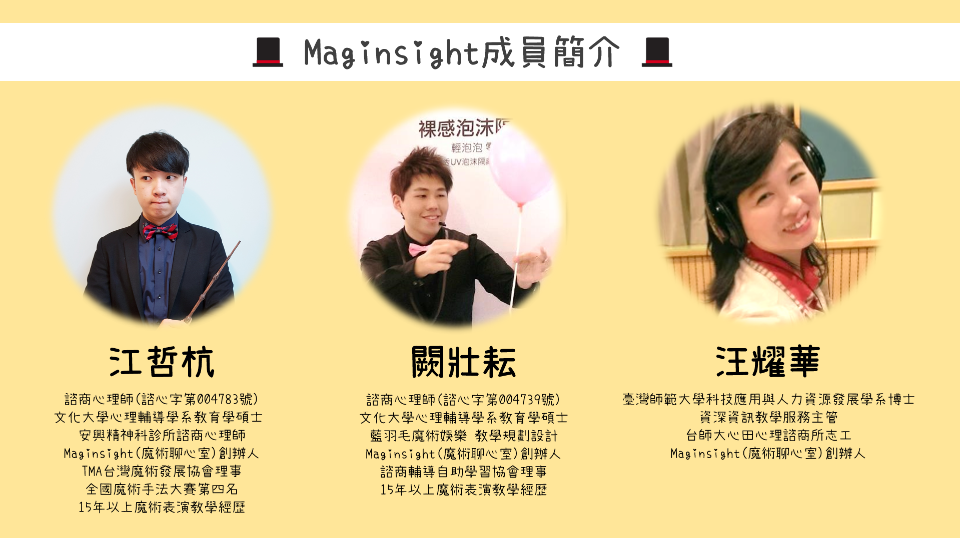 魔術聊心室(Maginsight)團隊由一位人資博士與兩位兼具諮商心理師與魔術師背景者所創立。「親子玩魔術」有別於坊間魔術課著重在魔術技巧學習,或是科學原理探索;而是將焦點擺在親子的互動間,讓家長與孩子一起學習魔術,攜手譜出驚喜難忘的篇章!