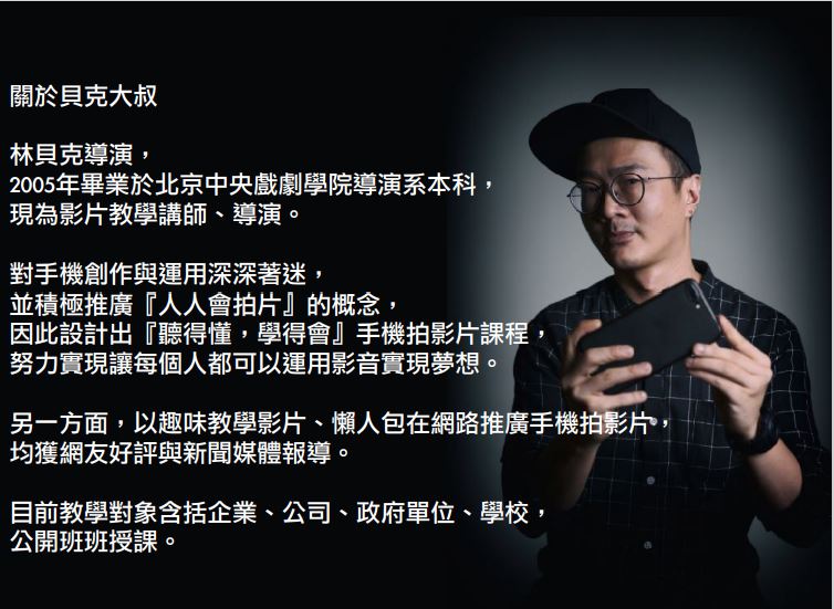 全方位數位影音創作「手機拍片課程」,教你從寫腳本、用手機拍片、剪輯、配音、上字幕,上傳分享到社群,讓你不再只能滑手機看別人的視頻,學會這招自己來玩Tiktok當Youtuber!超級講師網路手機達人貝克大叔,國內大小企業公協會團隊超過500場教學經驗,從最基礎運鏡、畫面,寫搞笑腳本、拍視頻剪輯做短片,上完課就有自己的作品!