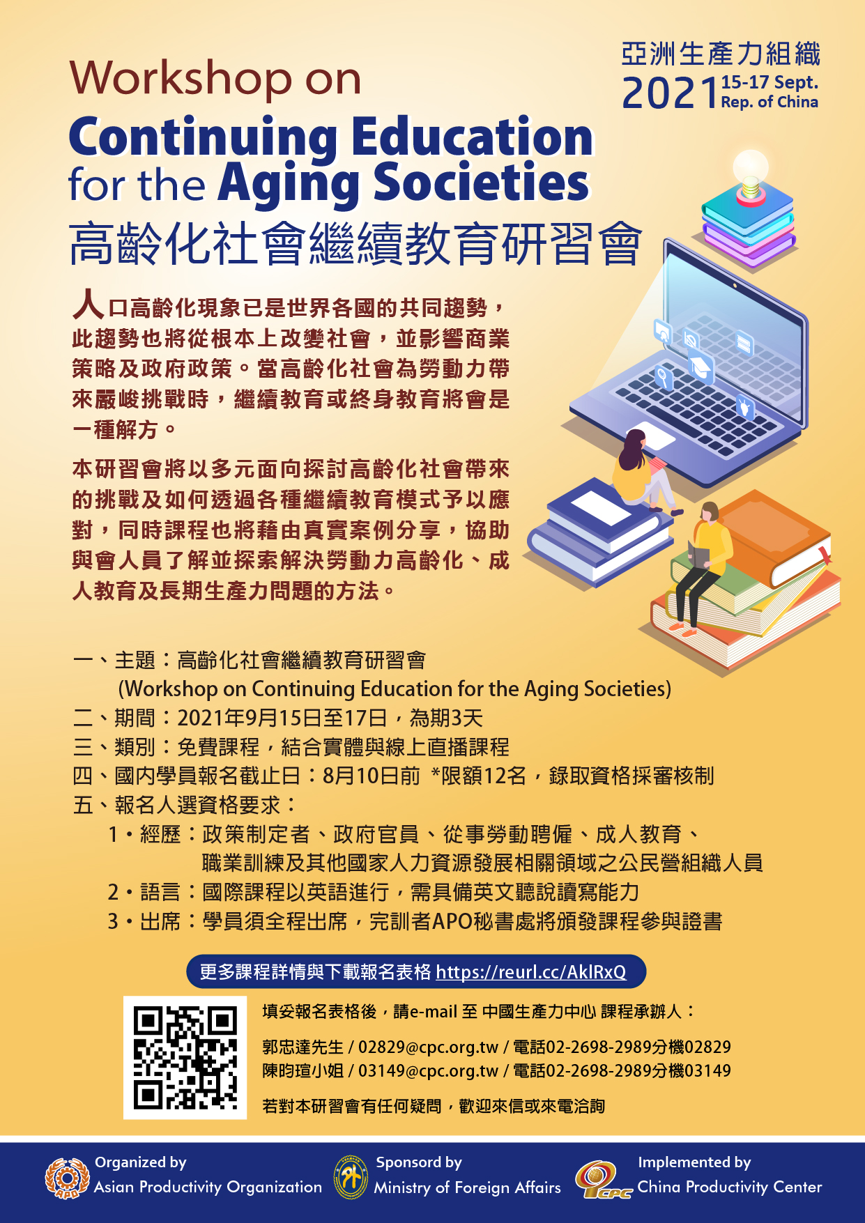 本研習會為期3天,將以多元面向探討高齡化社會帶來的挑戰及如何透過各種繼續教育模式予以應對,同時課程也將藉由真實案例分享,協助與會人員了解並探索解決勞動力高齡化、成人教育及長期生產力問題的方法。