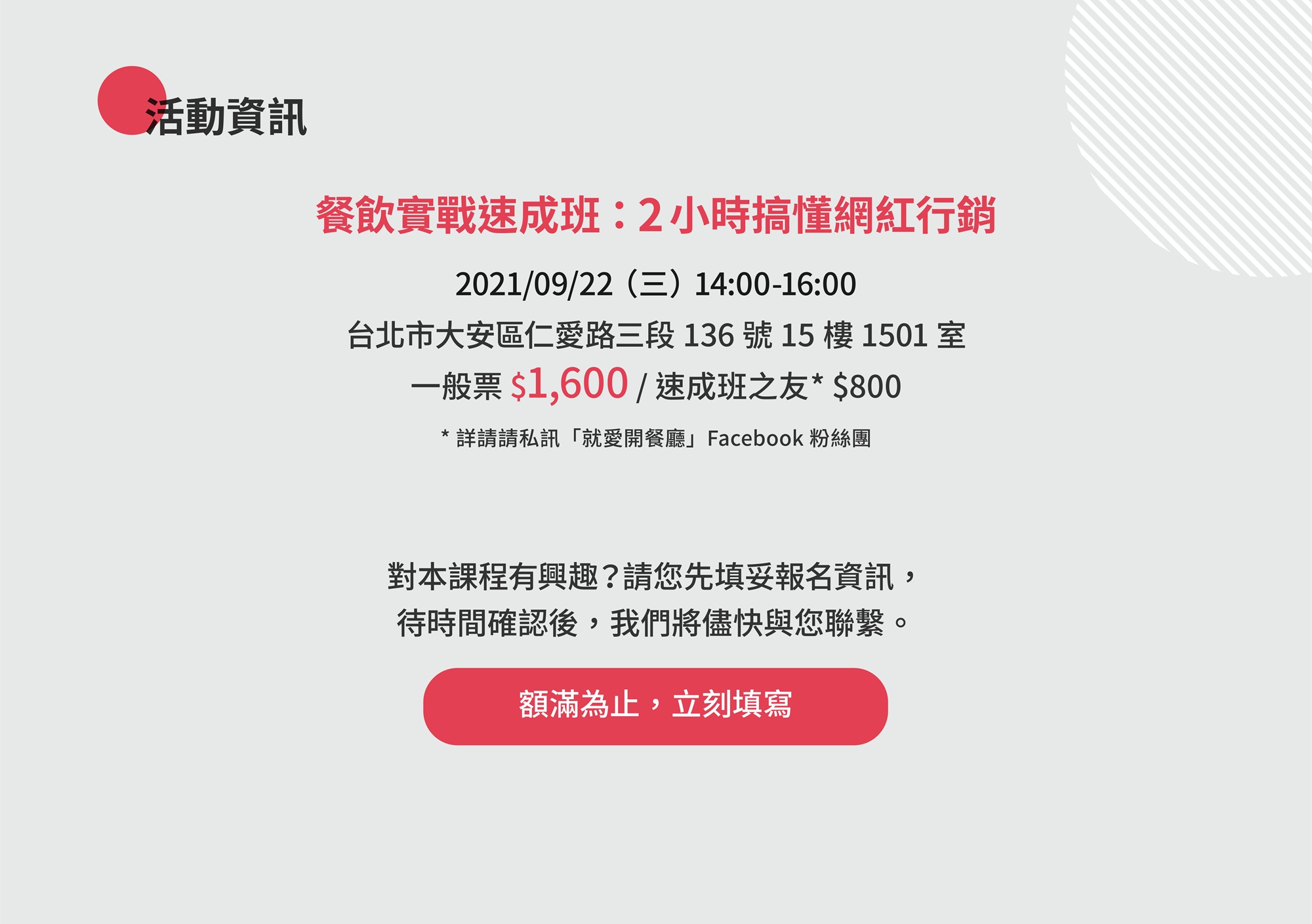 - 為維護課程品質,請勿攜帶孩童或寵物入場。