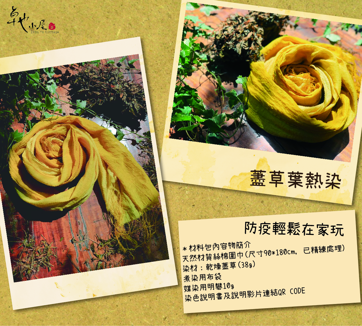 擁有獨門秘方的藎草材料包讓您可以在活動結束後,可以跟著老師的步驟及材料包上面的說明,完成屬於自己的植物染體驗!