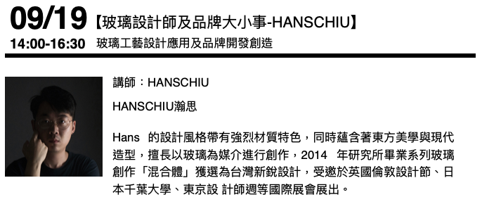 分享會主題為【文創發想及玻璃藝術展現】【品牌經營與創作管理】【玻璃設計師及品牌大小事-HANSCHIU】,了解不同講者對於品牌規劃及文創設計發想與執行上經驗,對於設計發想及經營管理及上能有不同的收穫。