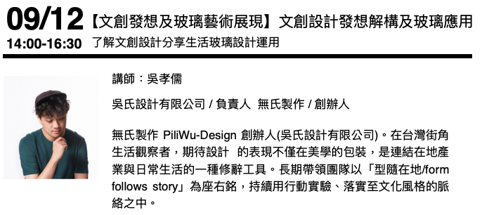 (110/09/12(日) 吳孝儒【文創發想及玻璃藝術展現】因颱風將至及疫情升溫將延期舉辦)