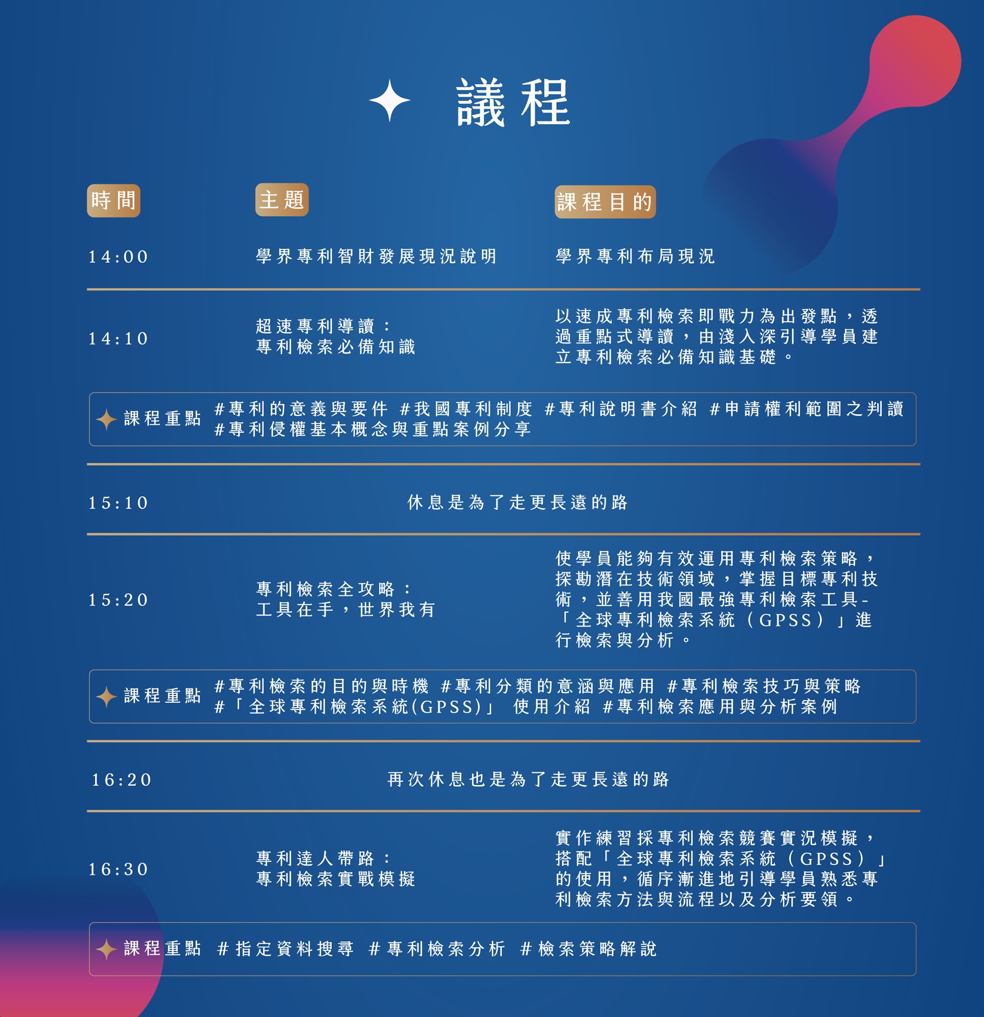 本課程以速成專利檢索即戰力為出發點,深入淺出建立專利檢索必備知識基礎,學習善用臺灣最強專利檢索工具「全球專利檢索系統(GPSS)」,並由專利達人帶領進行即時實作練習,有效引導學員在最短時間內掌握專利檢索方法、流程以及分析要領!