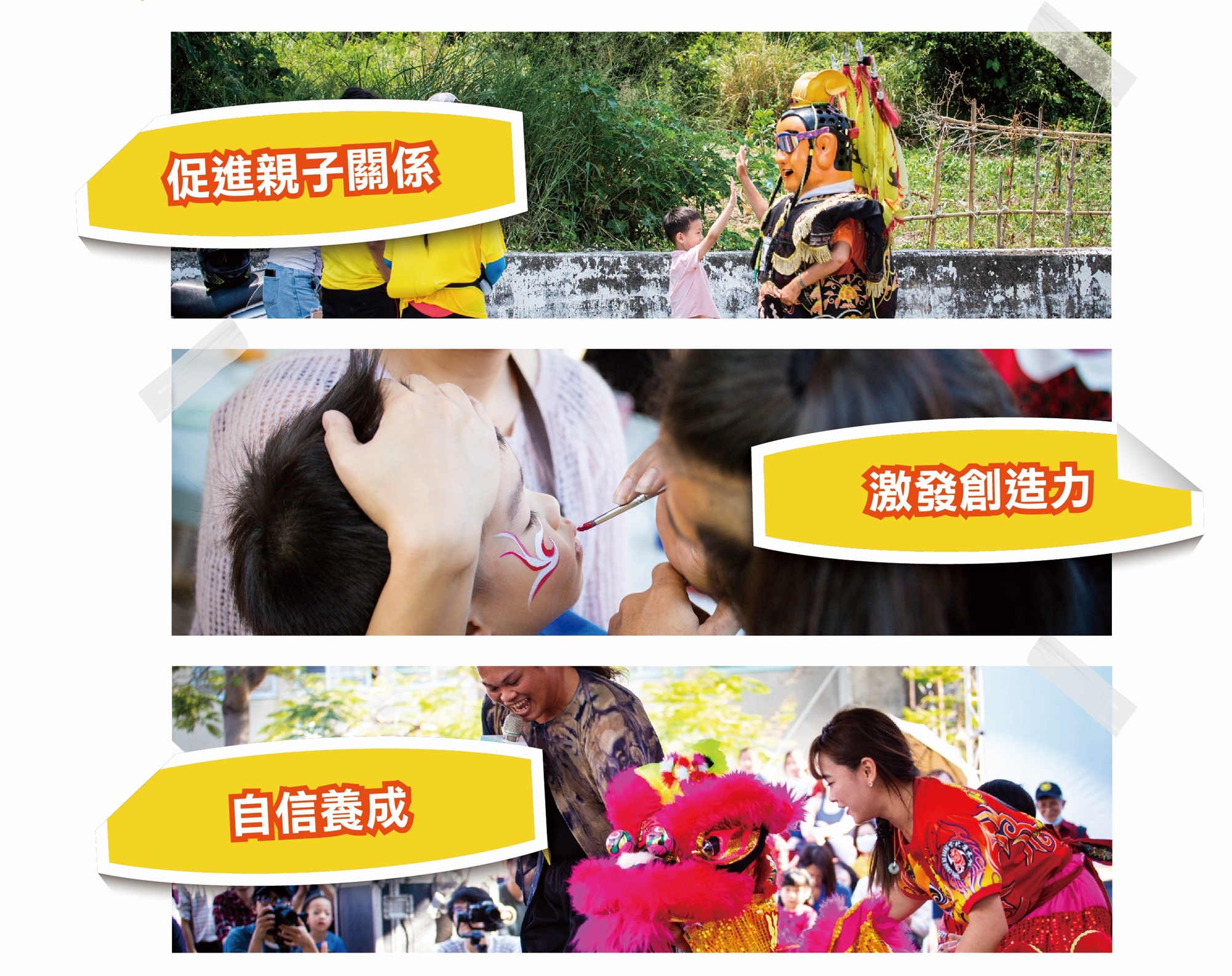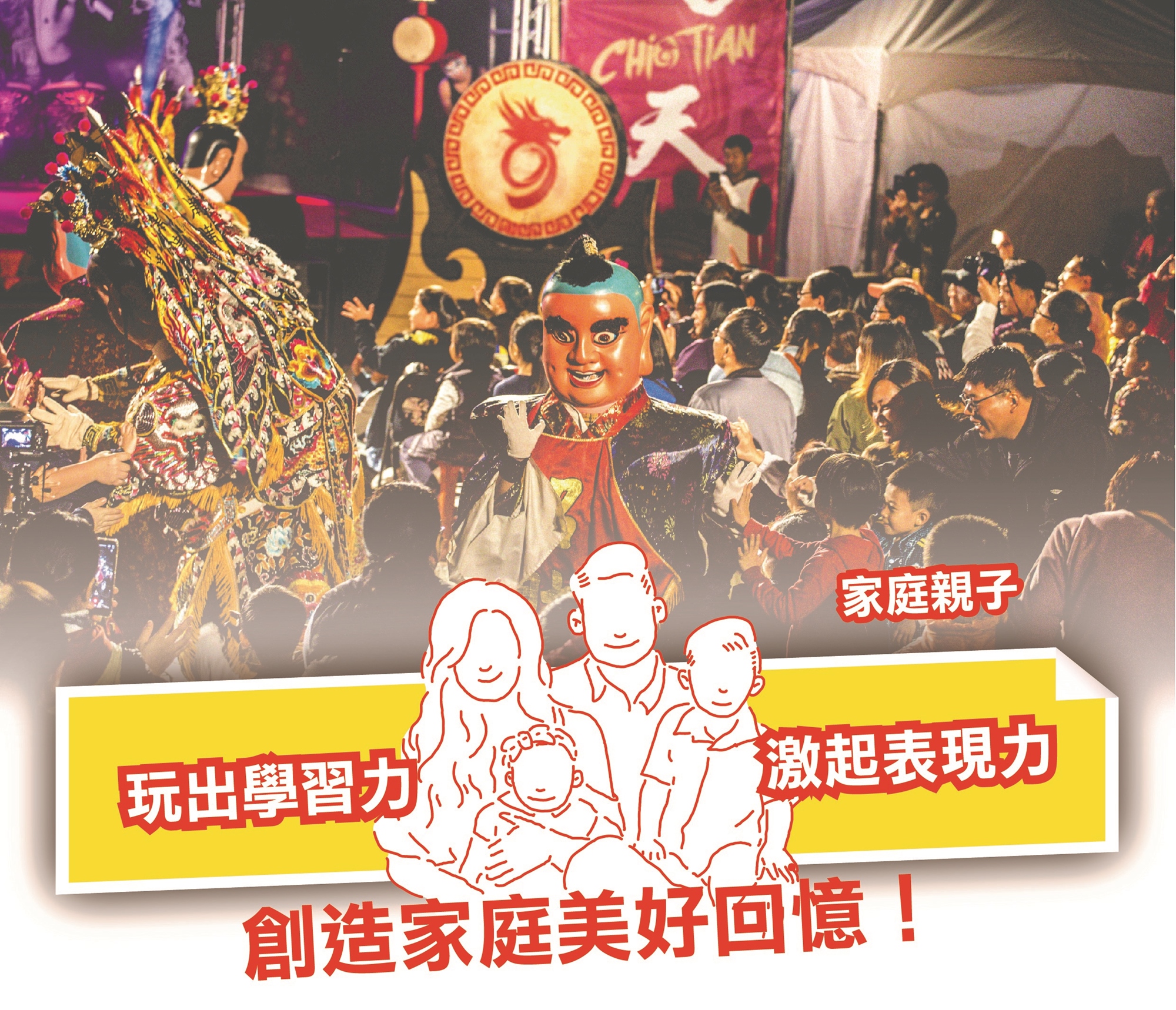 以及動態、充滿互動的擊鼓課程、紙箱三太子及神偶舞蹈,
