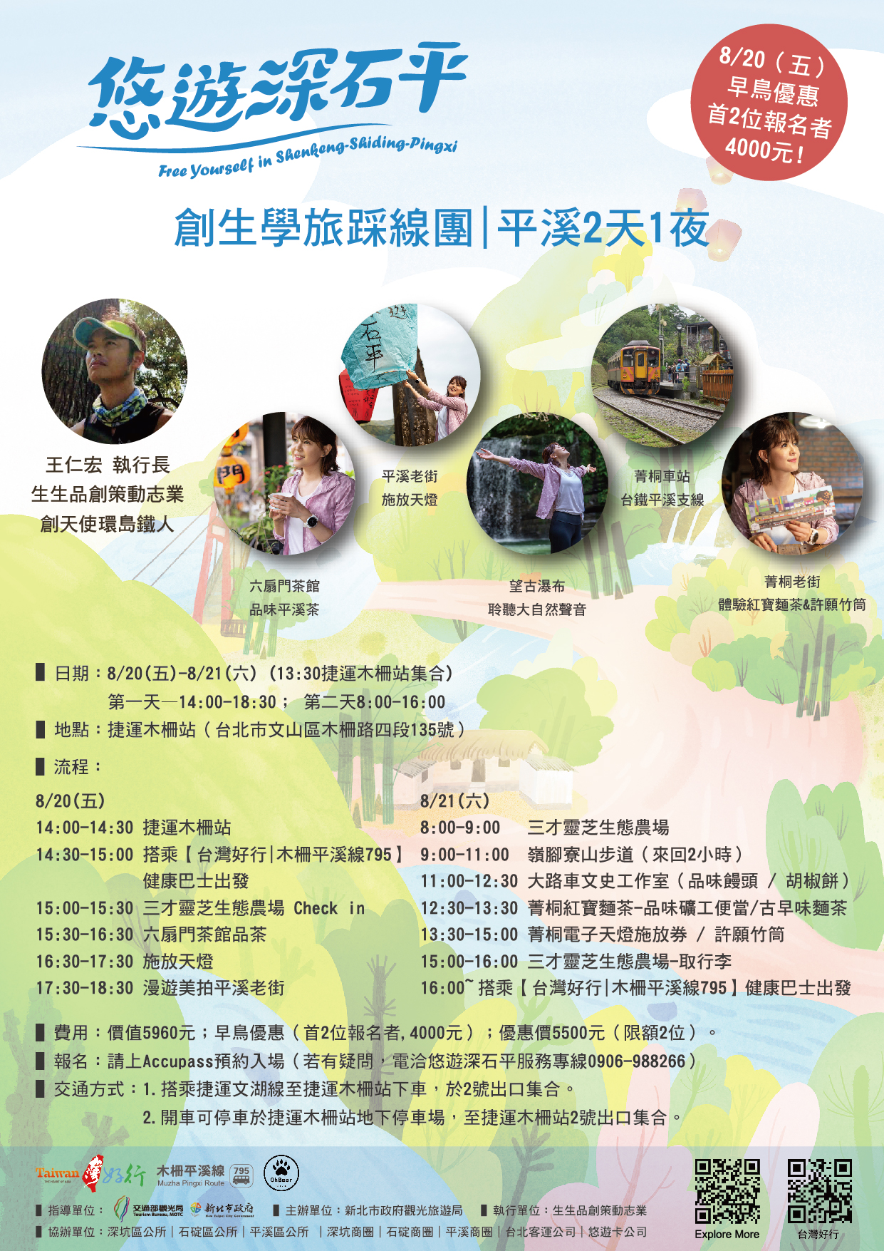 由創天使環島鐵人-生生品創王仁宏執行長帶路引導,邀請社會影響者、有志學習地方創生的青年與社會人士進行2天1夜交流。走訪在地深坑﹑石碇與平溪,了解在地發展情況與在地夥伴交流學習,體驗在地特色文化與品味。